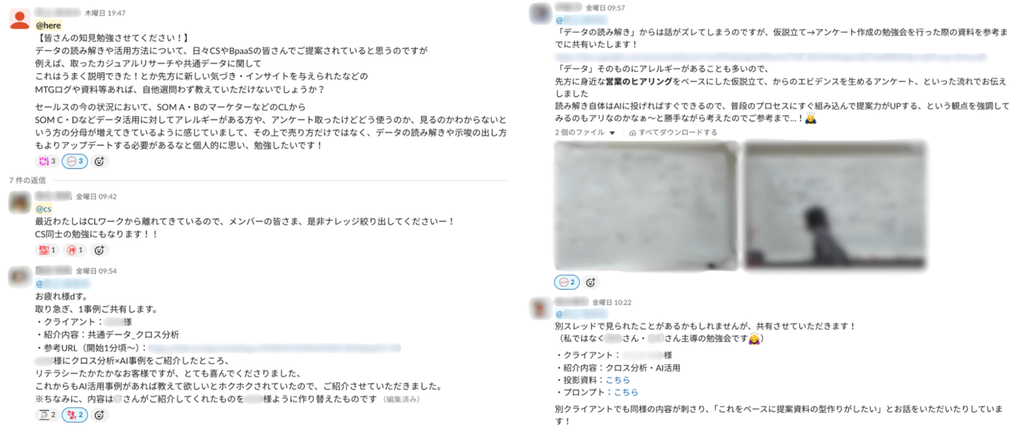 部署や役割の垣根を超えた協力体制も、ノウンズの特徴です。例えば、セールスチームから「このケース、どう回答すればいい?」という投げかけがあった際、本来の担当ではないCSメンバーが「その事例なら私が知っています!」と横から回答に入ったり、CSチーム内でも「Aさんの担当顧客の課題、Bさんの事例が使えるよ!」と情報が飛び交ったりすることは日常茶飯事です。