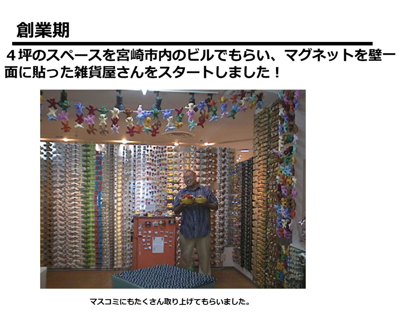 こちらがスタートした時の4坪の雑貨店。廃品回収から冷蔵庫2台を買ってきてペンキで色を塗り、壁にはホームセンターで買った鉄板をDIY好きの後輩に張ってもらい、スタート。買ったものは、中古のレジ、ペンキ、鉄板、机、プリンタのインクと10万円でおつりが来ました。