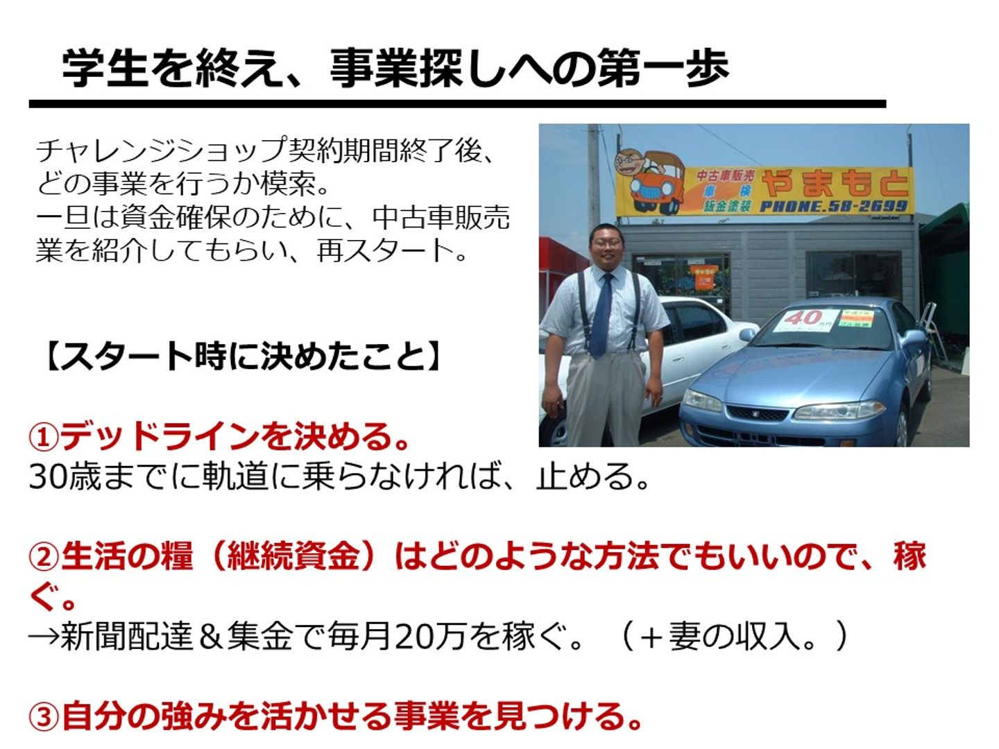 雑貨店は3月の契約満了と共に店じまい(卒業と同時)し、何をやっていいかわからなかった僕は、新聞屋さんの紹介で中古車販売をスタートしました。後ろの看板の絵は嫁さんに描いてもらい、まったく稼げなかったので、②に書いてあるような感じで食いつないでいました。(新聞が売れない今の時代だったら、20万も稼げていないと思います。学生は朝日新聞を読まないと就職できない!という神話があった新聞業界にとっては良い時期でした。)