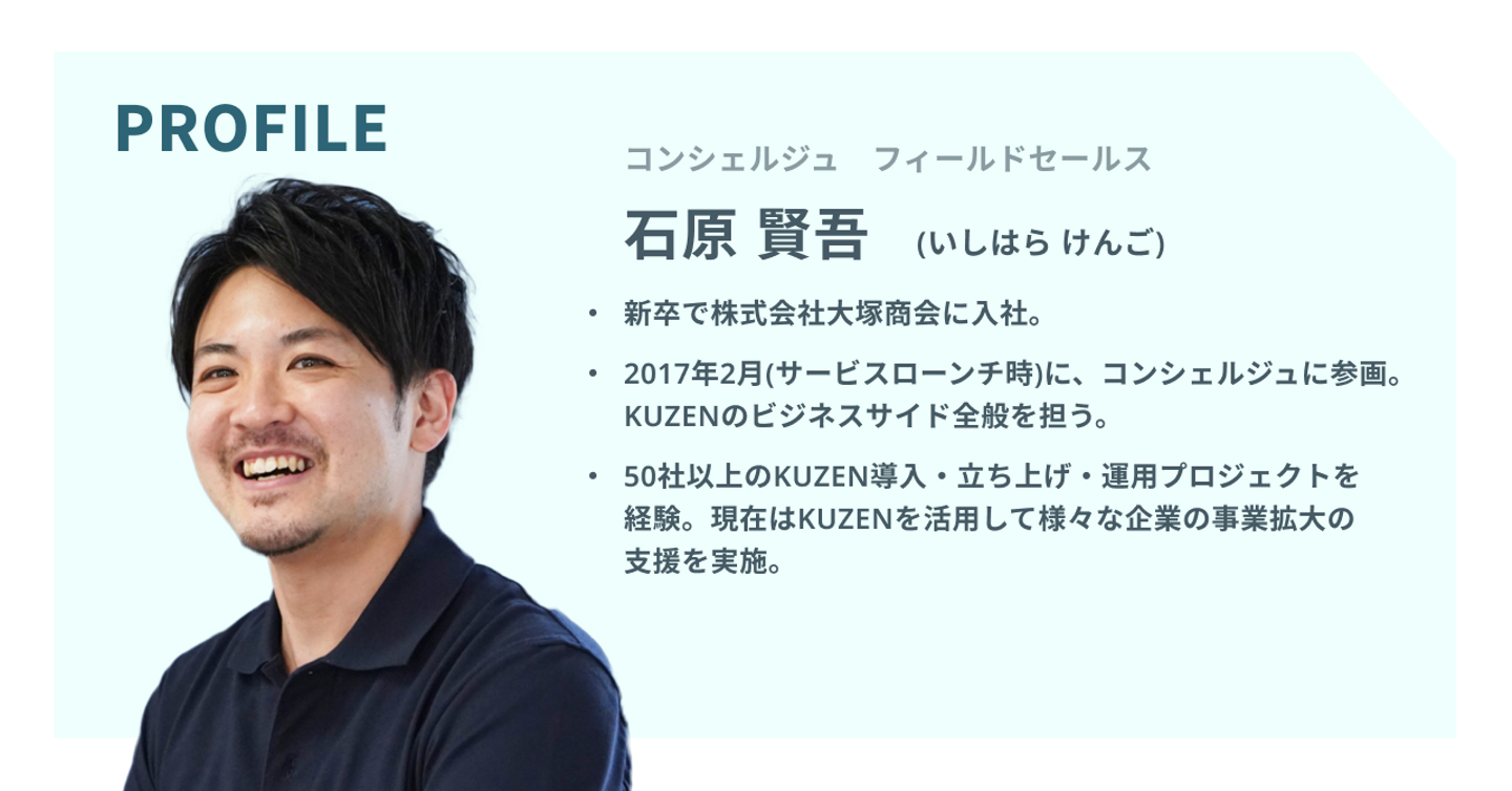 石原:僕がコンシェルジュに入社した時はまだ社会人2年目で、CEO太田さんやCTO白倉さんに分からないことは全部聞き、教えてもらってここまで営業としてのスキルやプロダクト理解が進みました。これからはKUZENの提案について分からないことがあればなんでも相談いただけるような存在になりたいですね。