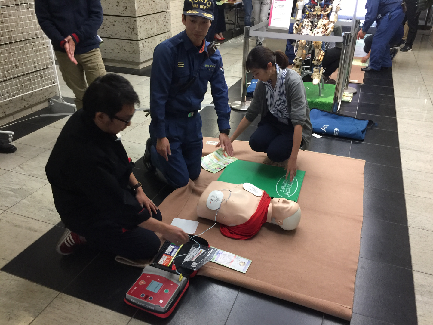 人工呼吸やAEDを利用した心肺蘇生の練習。水内先生のロボットの足元が少し見えて気になります(笑)