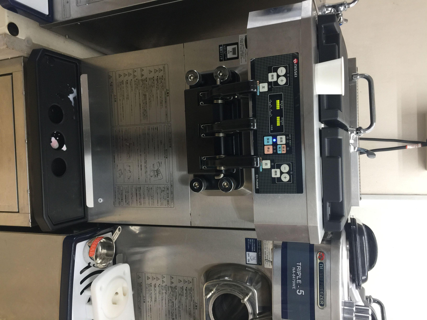 2槽式で、バニラ、ストロベリー、ミックスと3種類を絞り出す事が出来ます。こちらは、テーブルの上に置くタイプなのですが、片手をレバーを引き、片手はコーンを持つという事から、最近出来たタイプなんですね。小さく小スペースでも置けるという事から、関東圏ではこちらが売れているそうです。