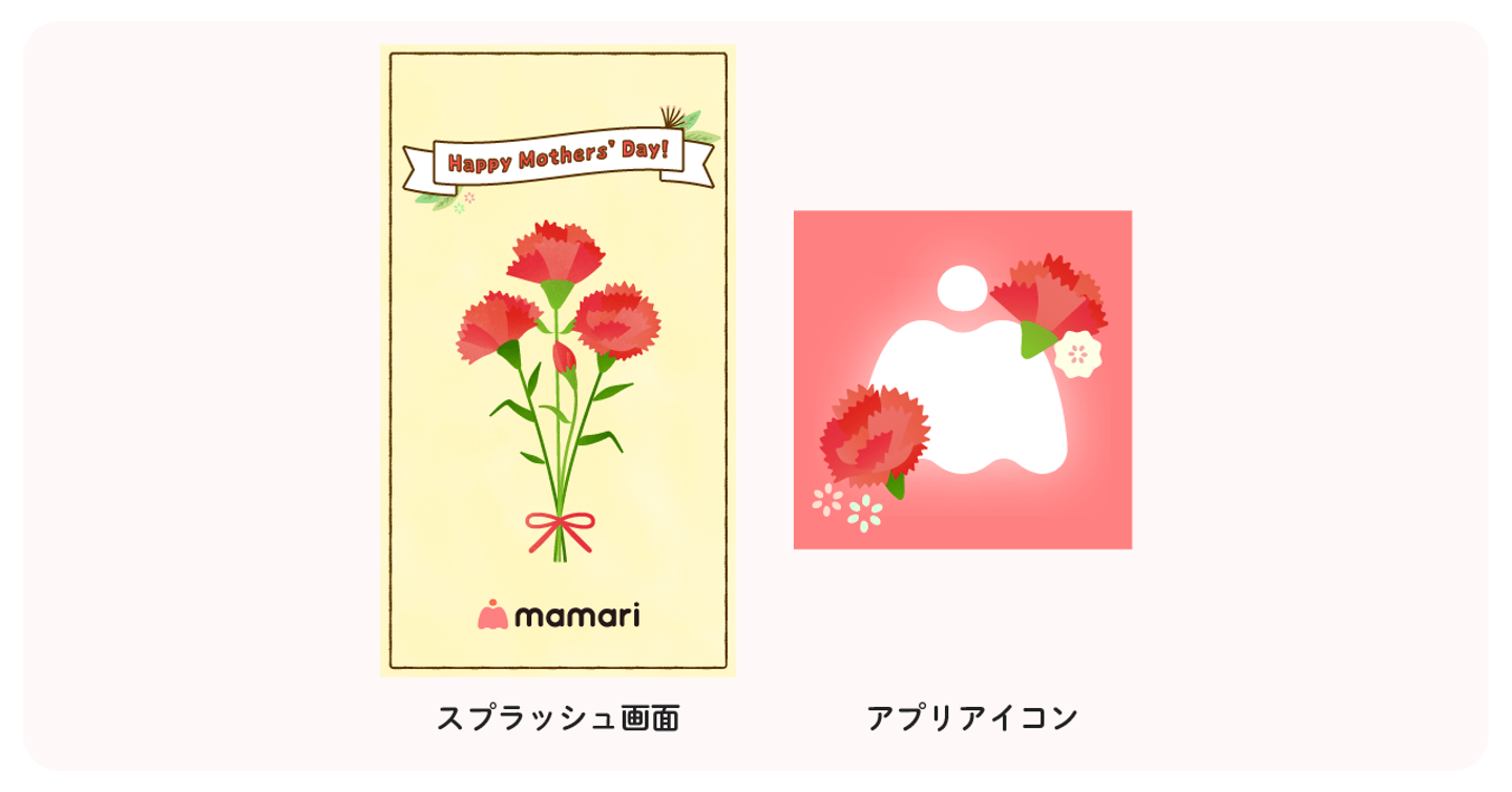 直近だと春のスプラッシュ画面、アイコンを制作しています。以前から季節にあわせて赤ちゃんのイラストの洋服を着せ替えしユーザーにワクワク感を届けていました。今回からは少しテイストを変え、母の日をテーマにママリからアプリを開いたユーザーに対して「母の日おめでとう」というメッセージを伝えたいと思い、メッセージ性のあるデザインに取り組んでみました。アプリを開いたときに、日々子育てで忙しくしているユーザーが少しでも肩の力を抜いてほっと一休みしてもらえたらなと思っています。