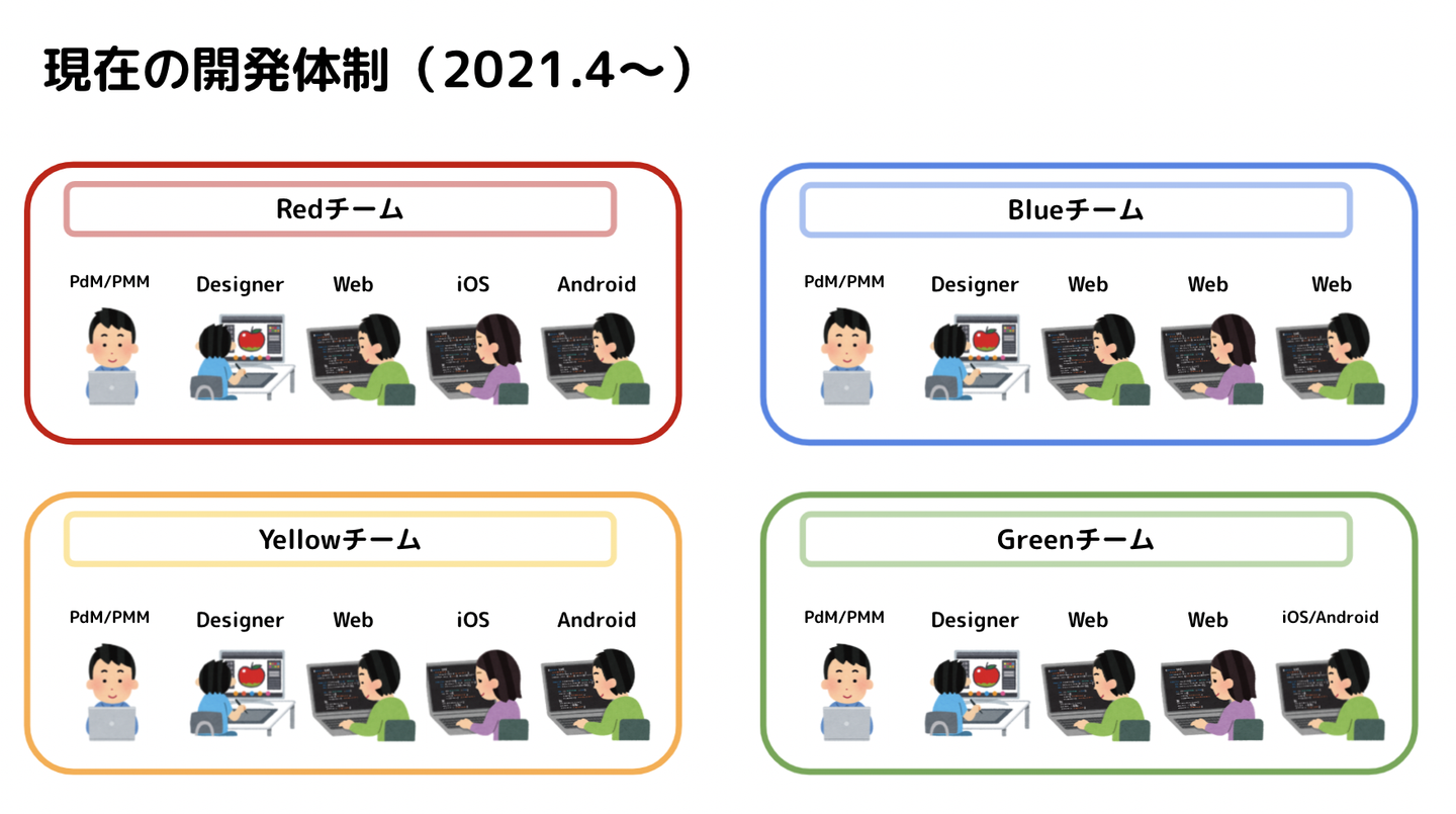 そういった状況でも、目指すゴールには何が重要なのかをスピーディに取捨選択しながら、最も良い形で開発できる体制を整えたいという思いから、機能の名前ではなく色でチームを分けることにしました。