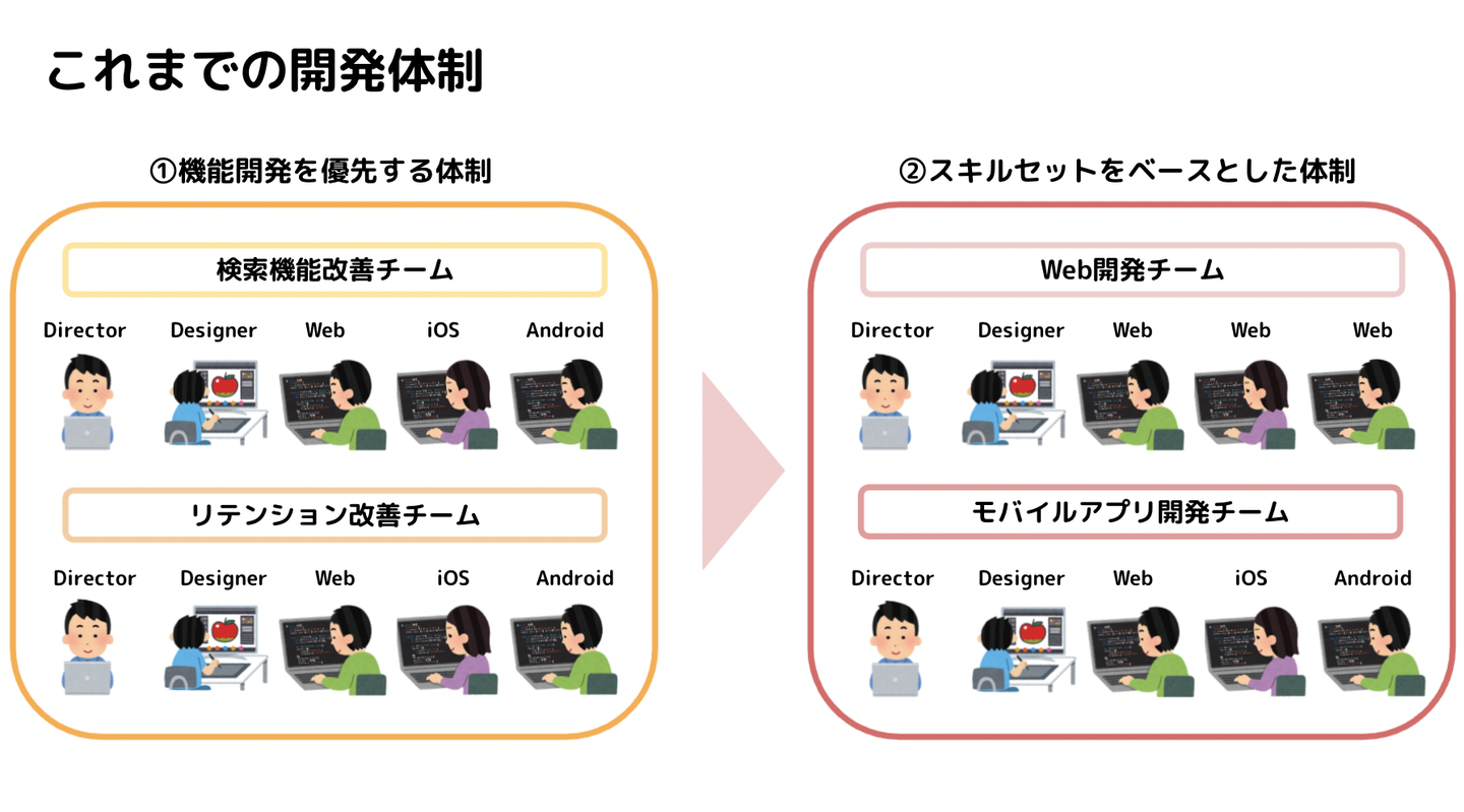 この課題を解消するために今度はメンバーのスキルセット(Web、モバイルアプリなど)をベースにチームを組み、各チームの状況に応じて開発する機能を割り振るという体制に変更しました。