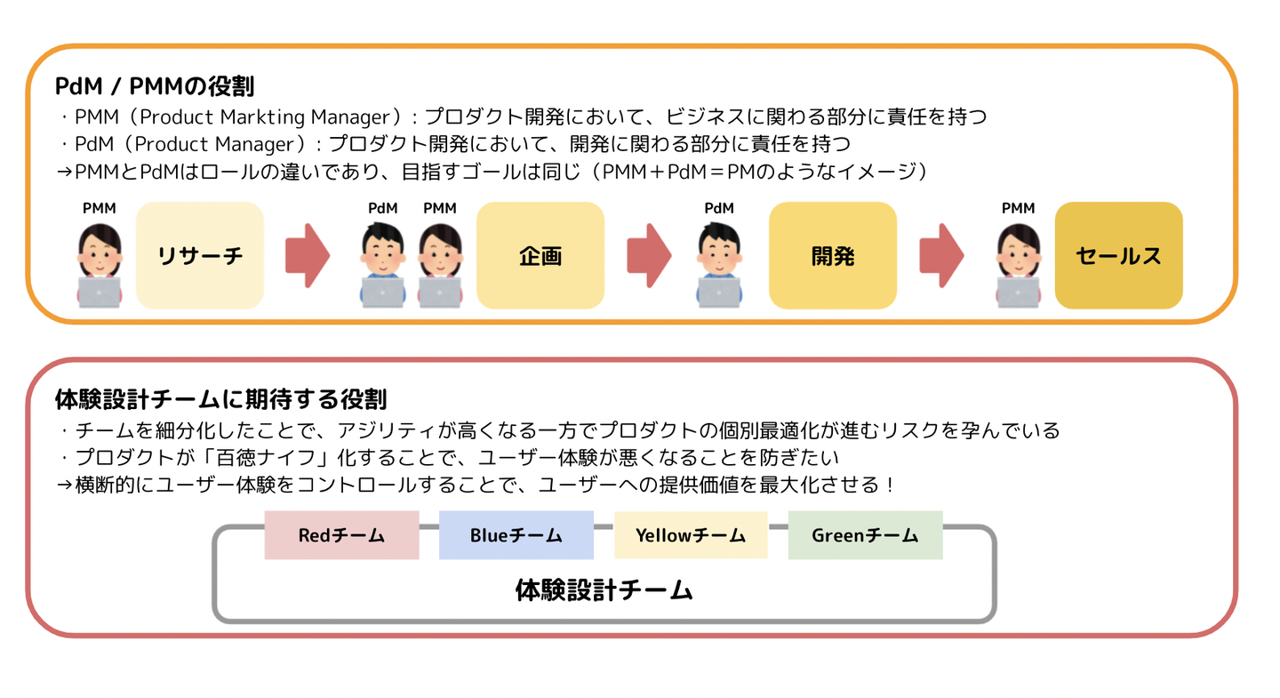 また、PdMとPMMへの期待値に社内でもばらつきがあったので、全員で認識を揃えるために役割の定義を作りました。PMMはプロダクト開発でビジネス側に責任を持つ、PdMはプロダクト開発で開発に責任を持つと定義し、PdMとPMMがタッグを組んで進めらえる体制をつくりました。