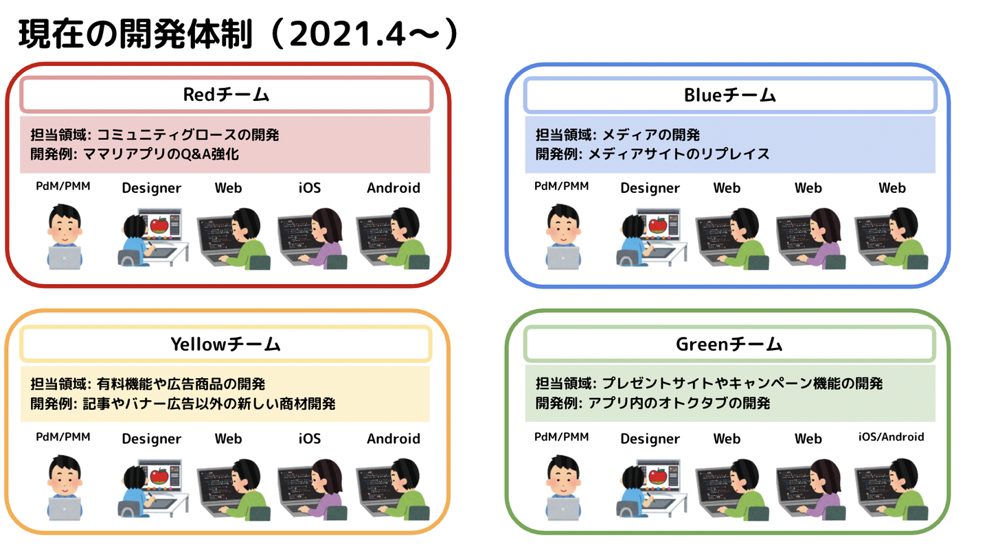 チームは開発する機能毎に構成しており、コミュニティグロースをRedチーム、メディアの開発をBlueチーム、有料機能や広告商品の開発をYellowチーム、プレゼントサイトやキャンペーン機能の開発をGreenチームで担当しています。
