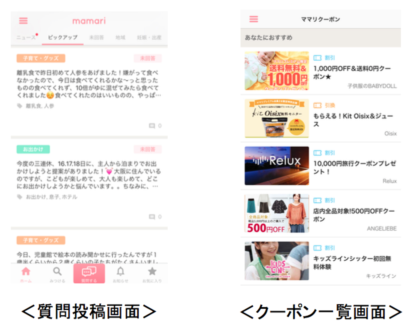 家族の買いものに役立つ約40種類の「おトクなクーポンや特典」を提供します(随時追加予定)。 西松屋、ベルメゾン、ニッセン、コンビミニ等、ママたちの間で人気が高いベビー用品店を始め、「ママリ」内の投稿で出現頻度の高いブランドのクーポンや特典をお届けします。