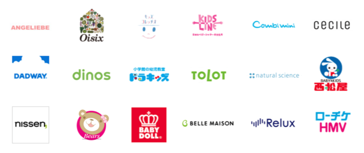 株式会社エンジェリーベ、オイシックスドット大地株式会社、株式会社KDDIウェブコミュニケーションズ、株式会社キッズライン、コンビネクスト株式会社、株式会社ディノス・セシール、株式会社ダッドウェイ、株式会社小学館集英社プロダクション、株式会社TOLOT、株式会社ナチュラルサイエンス、株式会社西松屋チェーン、株式会社ニッセン、株式会社ベアーズ、株式会社コージィコーポレーション、株式会社千趣会、株式会社Loco Partners、株式会社ローソンHMVエンタテイメント