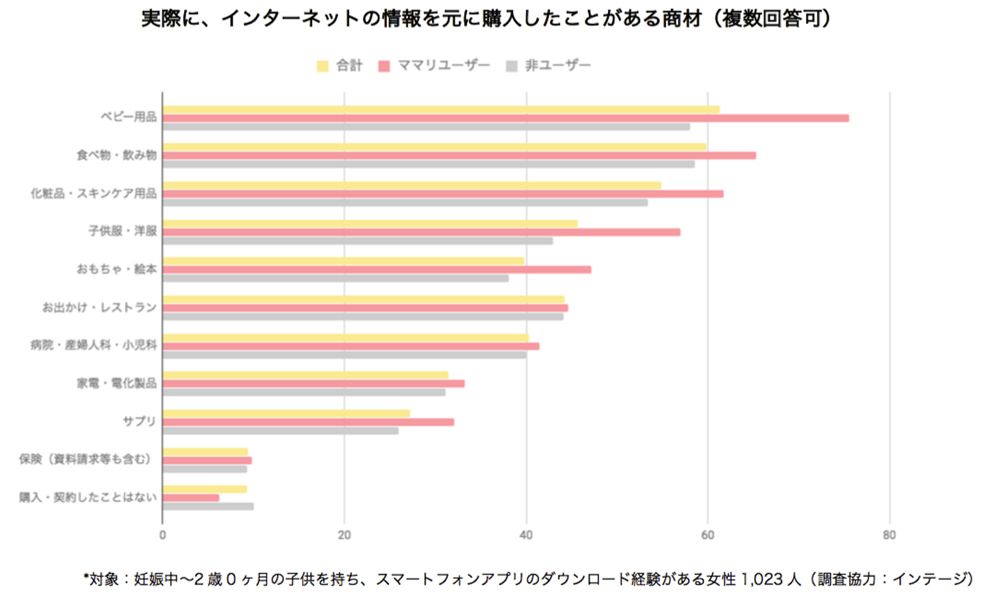 インターネットの情報を元に購入したものとしては、第1位「ベビー用品」(61.3%)、第2位「食べ物・飲み物」(59.8%)、第3位「化粧品・スキンケア用品」(54.9%)という結果になりました。「家電・電化製品」(31.5%)、「保険」(9.4%)など高額商品購入者もいました。
