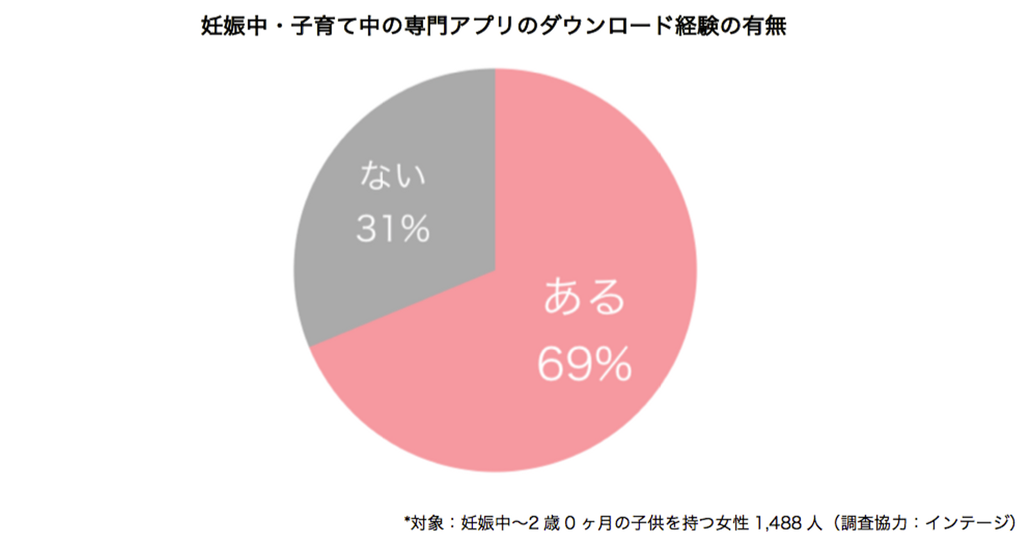 妊娠中〜2歳0ヶ月の子供を持つ女性の68.8%が妊娠・子育て向けのスマートフォンアプリのダウンロード経験があると回答しました。