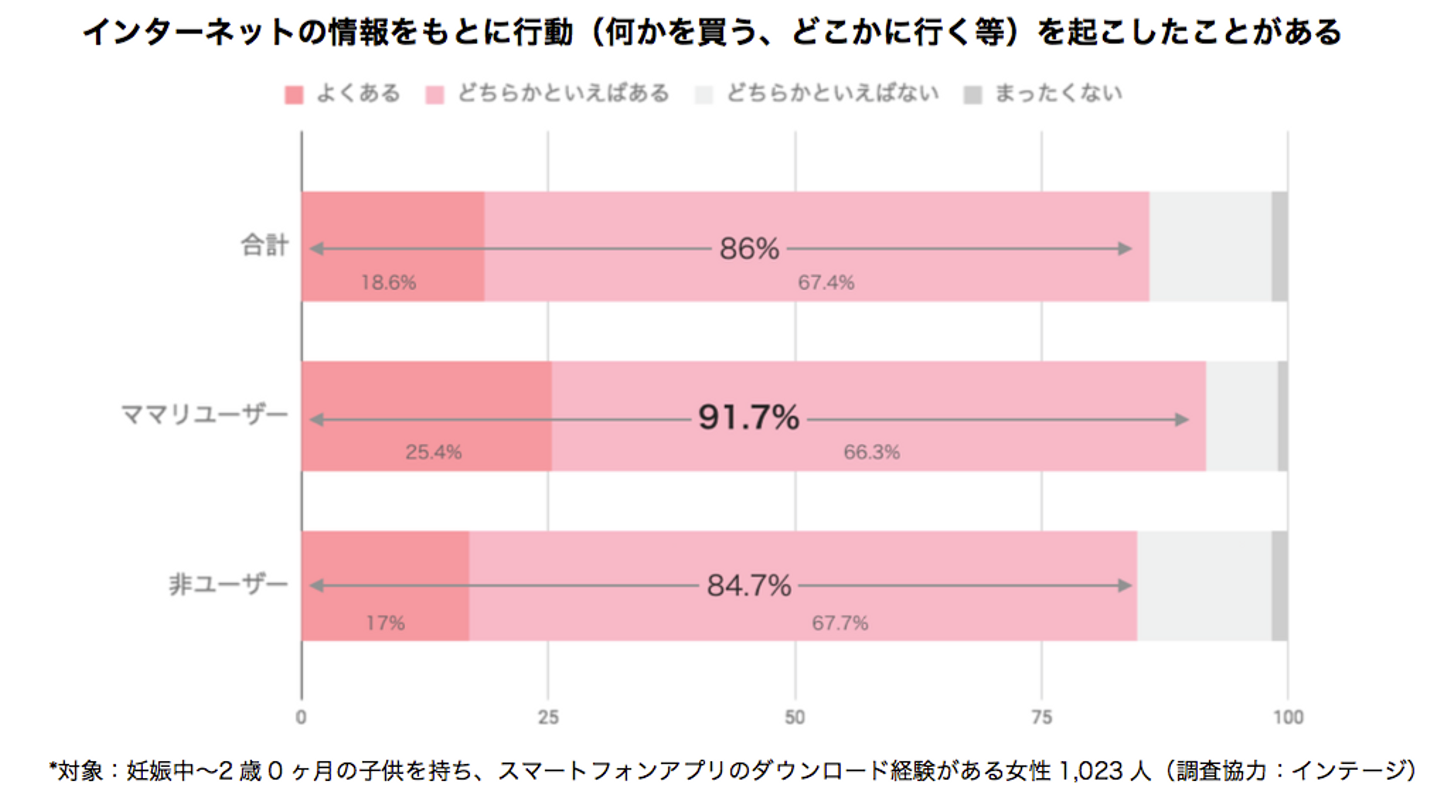 スマートフォンアプリダウンロード経験がある女性の約86%がインターネットの情報を元に商品購入やお出かけ先を決めるなどの行動を起こしたことがあることが分かりました。前述のママリのユーザーに絞ると、その割合は約92%という結果になりました。