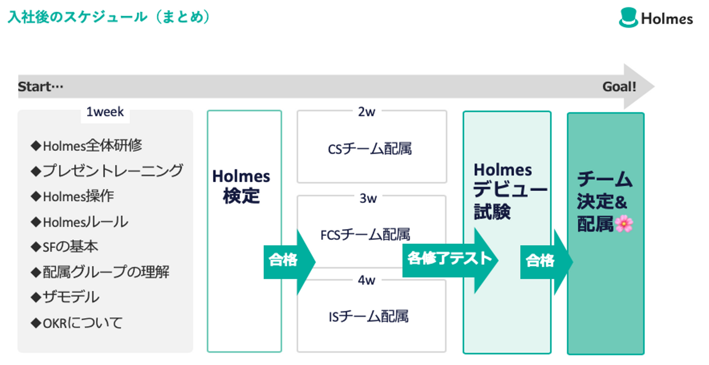 【新入社員研修】カスタマージャーニー全体を俯瞰して他チーム連携と 顧客の課題解決 を強化! セールスセクションでは、入社してから実際にチームに配属されるまで、トレーニングやコーチングのプログラムが約1ヶ月設計されています。これは新卒採用でも中途採用でも同様です。第1週目にはHolmesのプロダクトコンセプトや世界観をしっかりと理解し、Holmesの使い方やSalesforceのThe Modelの基本講座、そして配属グループの理解やそれぞれのOKRやKPIを把握します。その上で、その習得度合いを確認するためにHolmes社員の前で、Holmesのセールスパーソンとしてプロダクト紹介や操作デモなどのロールプレイを行います。これが「Holmes検定」です。その結果が社員投票によって一定の基準に達したら、次の2週目からはカスタマーサクセス・フィールドカスタマーサクセス・インサイドセールスと、セールスセクションの各チームに配属され、実務を経験していただいた後、最終的にお客様の前に出ることが可能かどうか「Holmesデビュー試験」を行います。この試験を突破することで遂に当初想定していたチームに配属されるという流れです。