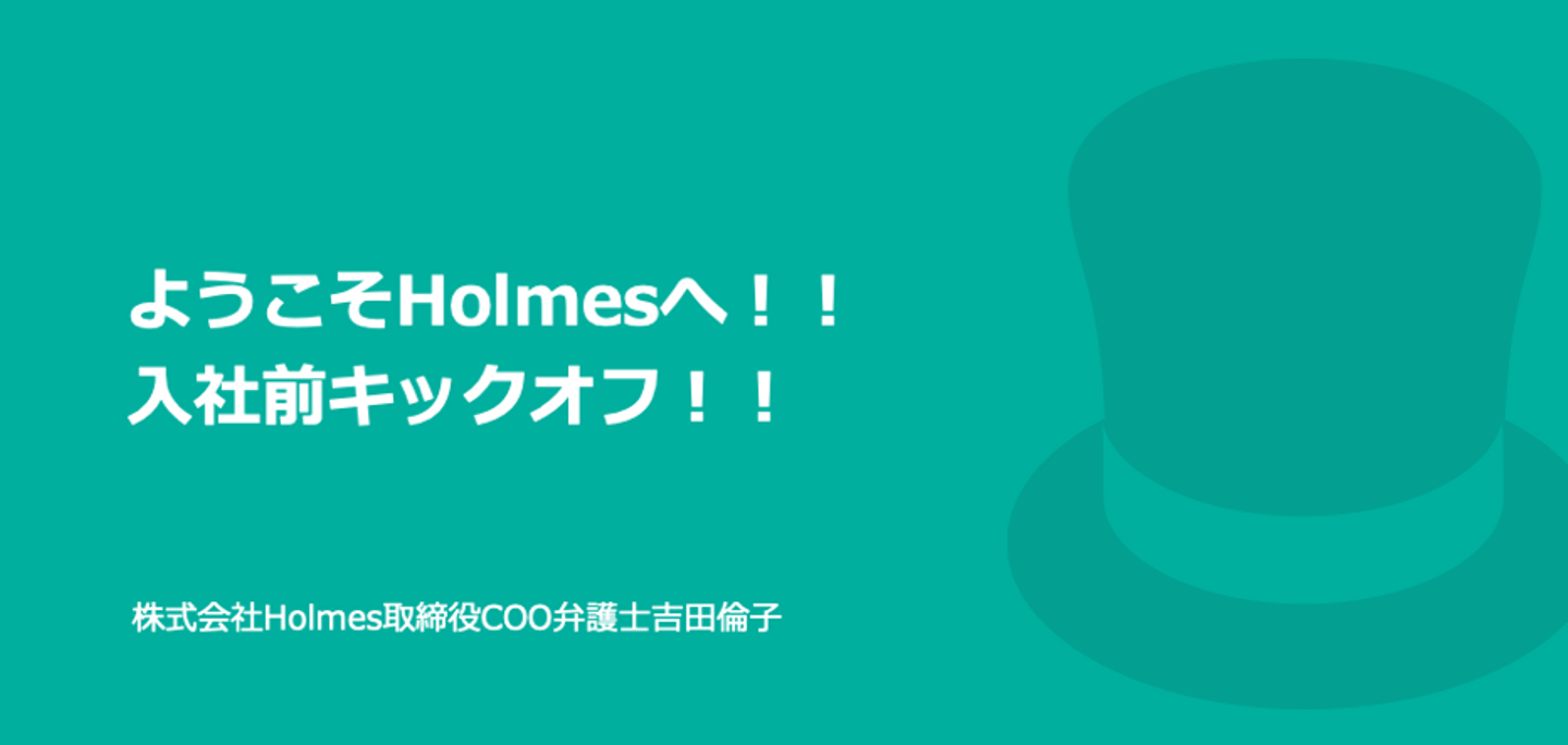 Holmesの”魅せる”採用オンボーディング プログラム! ◇入社前 ・入社前キックオフ ・内定者懇親会 ◇入社後 ・入社オリエンテーション ・新入社員研修(1ヶ月) ・メンター ・1on1(ビジョン1on1 & OKR1on1) ◇入社前 【入社前キックオフ】入社前の助走期間の過ごし方。Holmesで働くことを楽しみにしてもらう!ワクワク! 内定が決まり入社するまでの期間は、現職で業務引き継ぎを行ったりで忙しいもの。でも次の会社への期待と不安で一杯になるのがこの時期です。我々Holmesでは入社した後にスタートダッシュを決めて少しでも早く活躍していただけるようにセールスセクションでは「入社前キックオフ」という時間を1日設けています。そこでは、Holmesのカルチャーのことやメンバーのこと、入社前までに取り組んできて欲しいことなどを案内して、入社日までに気持ちのウォーミングアップをしてもらいます!