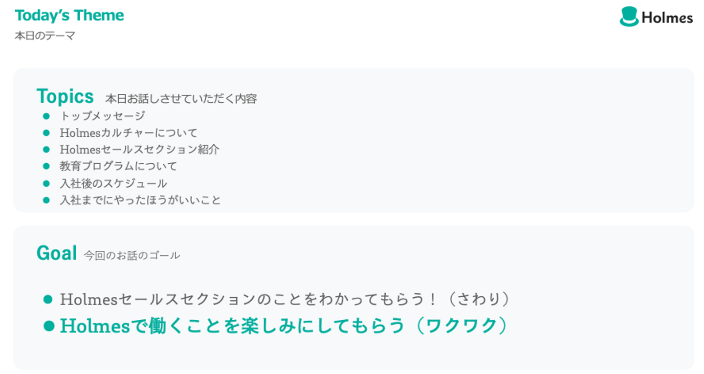 キーワードは「”魅せる”採用オンボーディング!」 とにかくHolmesのことを好きになってもらう。ハートを掴む。夢中にさせる。これが肝です。 Holmesの魅力はどんな仕事をするか以上に「どんな仲間とどんな目標に向かって何にチャレンジするか」ここに共感し、ワクワクしてもらうことが重要!そのために会社が目指す“旗印“を大事にしたい、そう考えています。