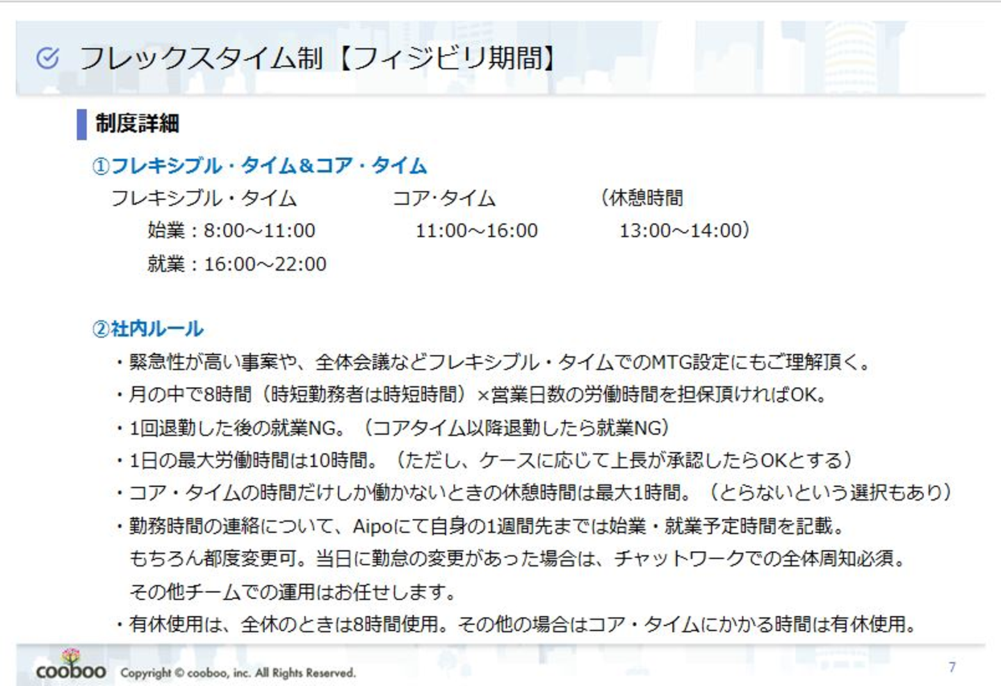 しかし、今の仲間であれば、コーボーらしくフレックスを存分に活用して自らの働きやすさも増し、会社としても生産性を更に追及していくこと出来る!と本導入が決定しました。(フィジビリの際からルールなどは少しアレンジを加えました)