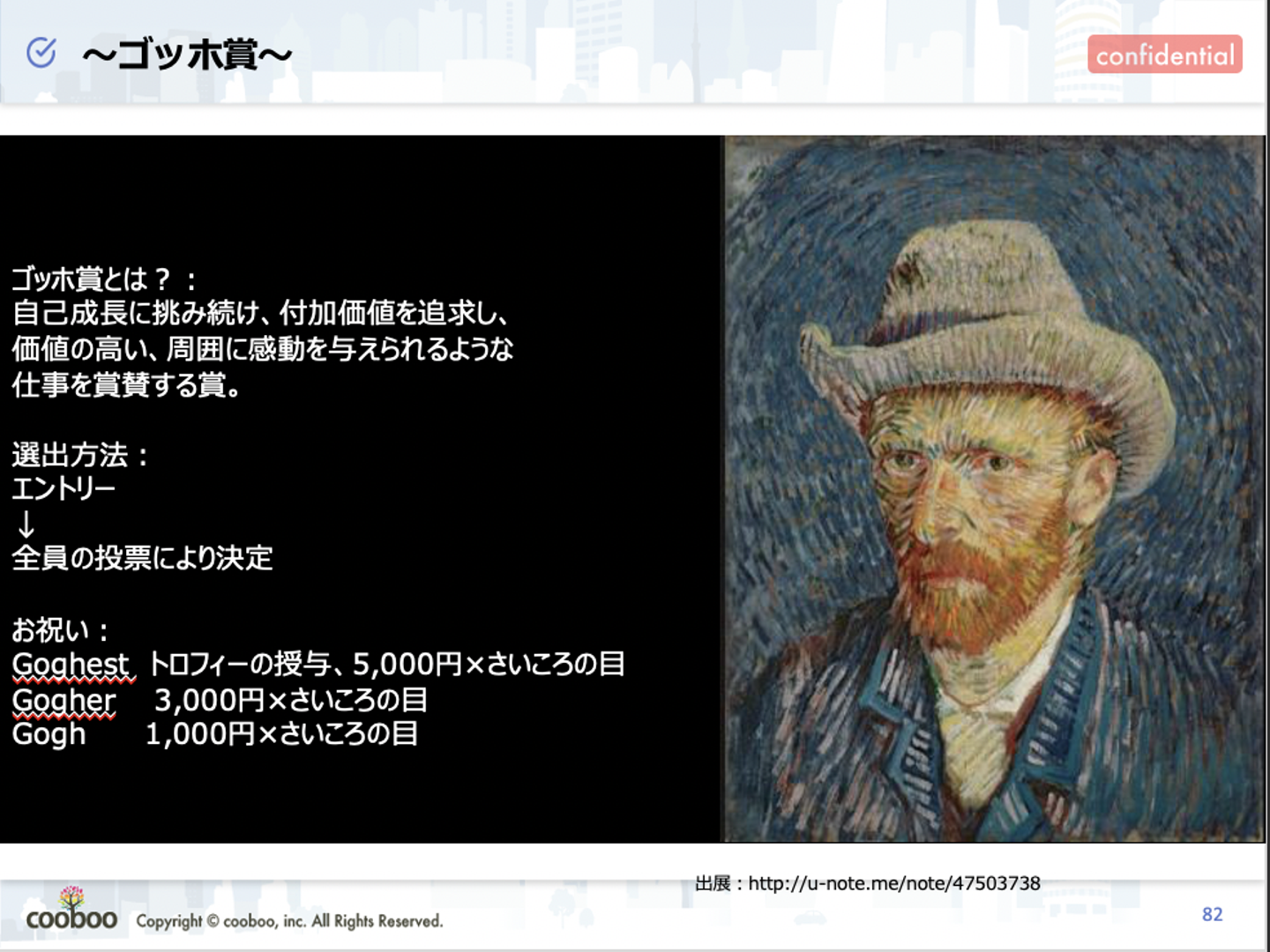 梁瀬:表彰制度を取り入れるのは初めてでしたが、やっぱり皆が覚えやすくてキャッチーな者が良いなと思ってネーミングを考えていました。その中で出会ったのが、フィンセント・ファン・ゴッホ氏だったんです。ゴッホって今ではかなり有名な画家だけど、実は生前に彼の絵が売れたのって1枚だけで。身内である弟が購入したものだけだったらしいんです。(諸説あり)
