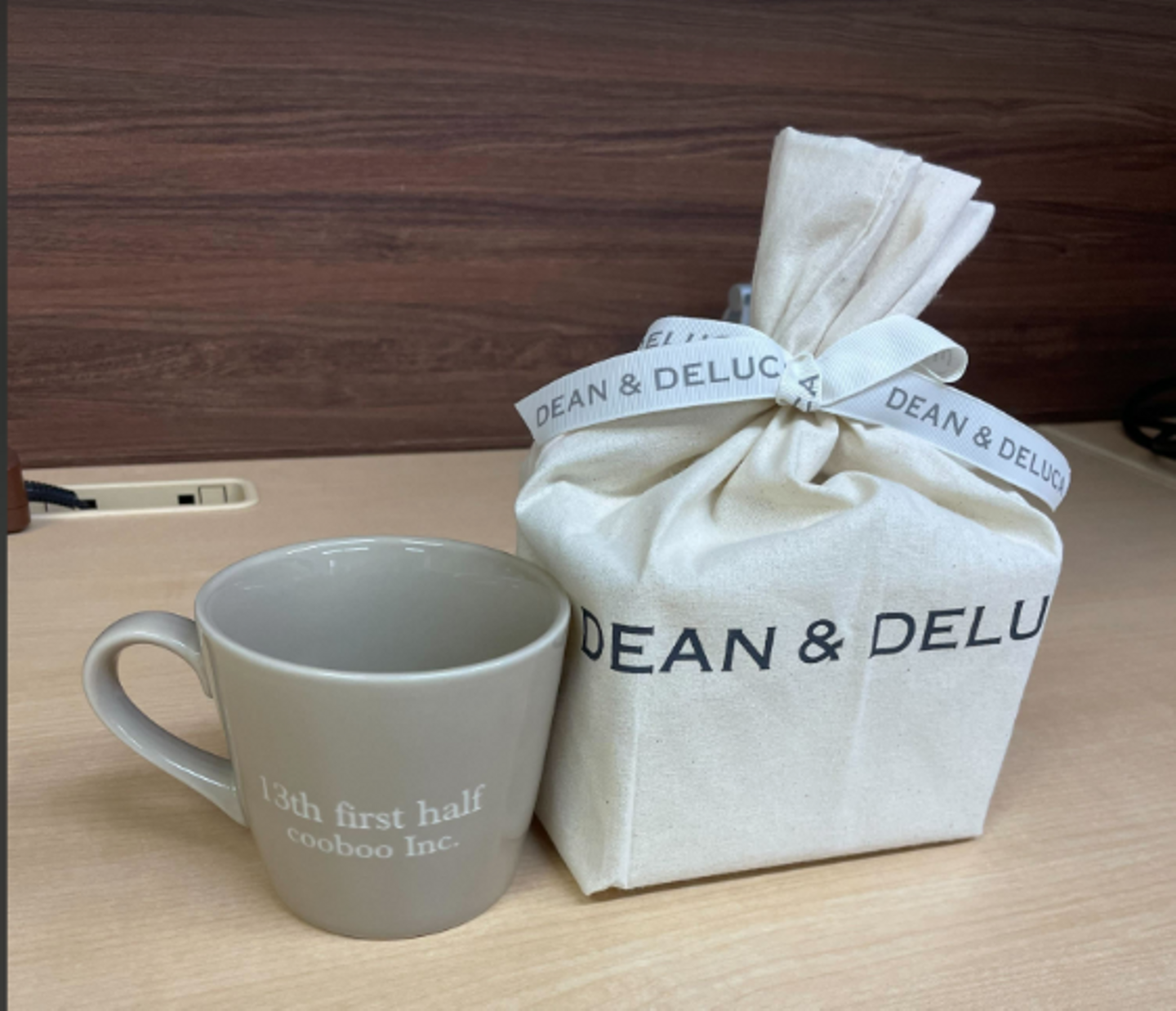 今回のお祝いは…社名ロゴ入りのマグカップ!