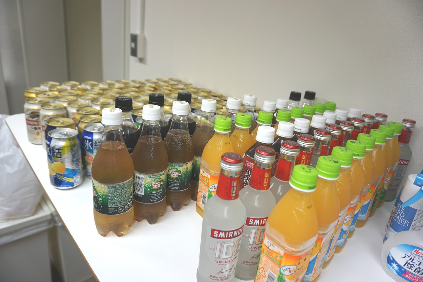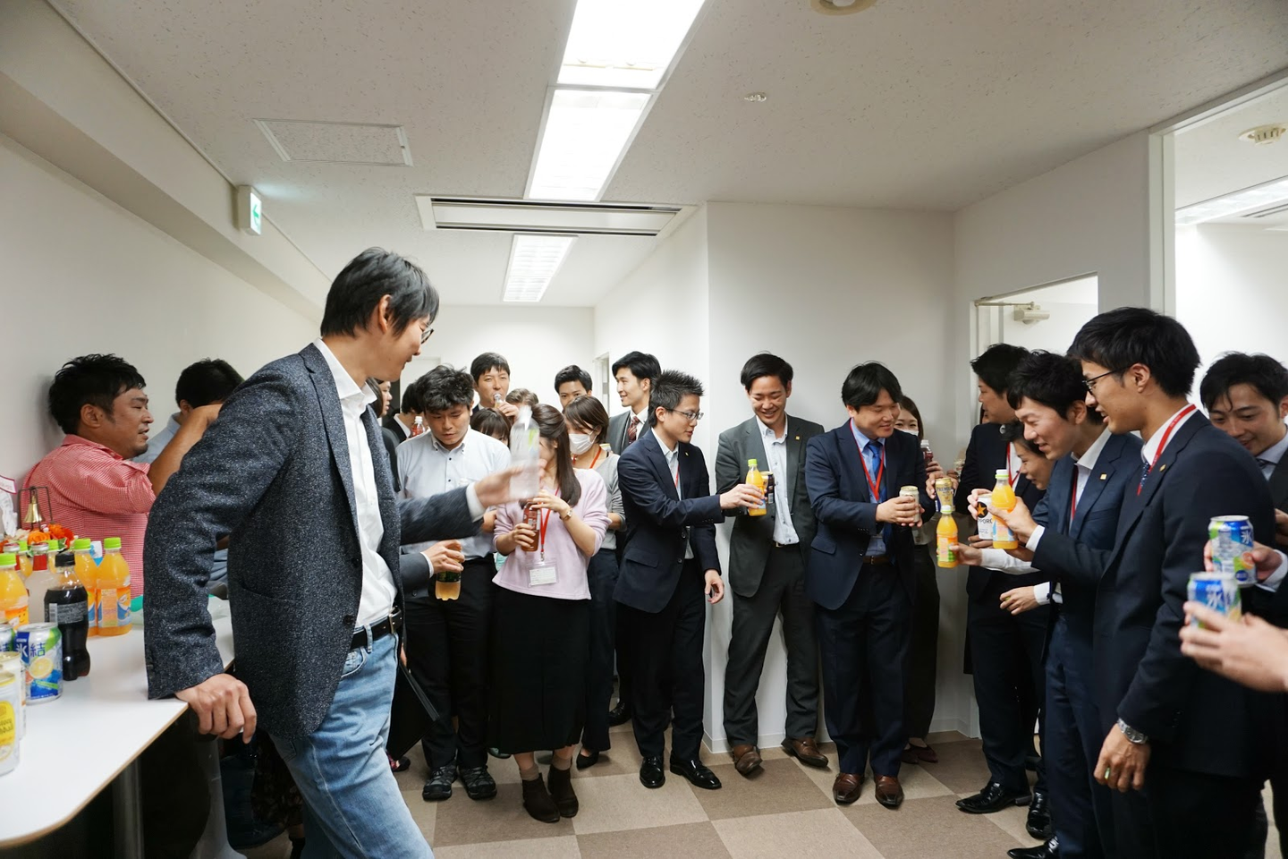 大阪本社では、お酒やジュース、食べ物にはお寿司やピザ、チキンなども用意して、