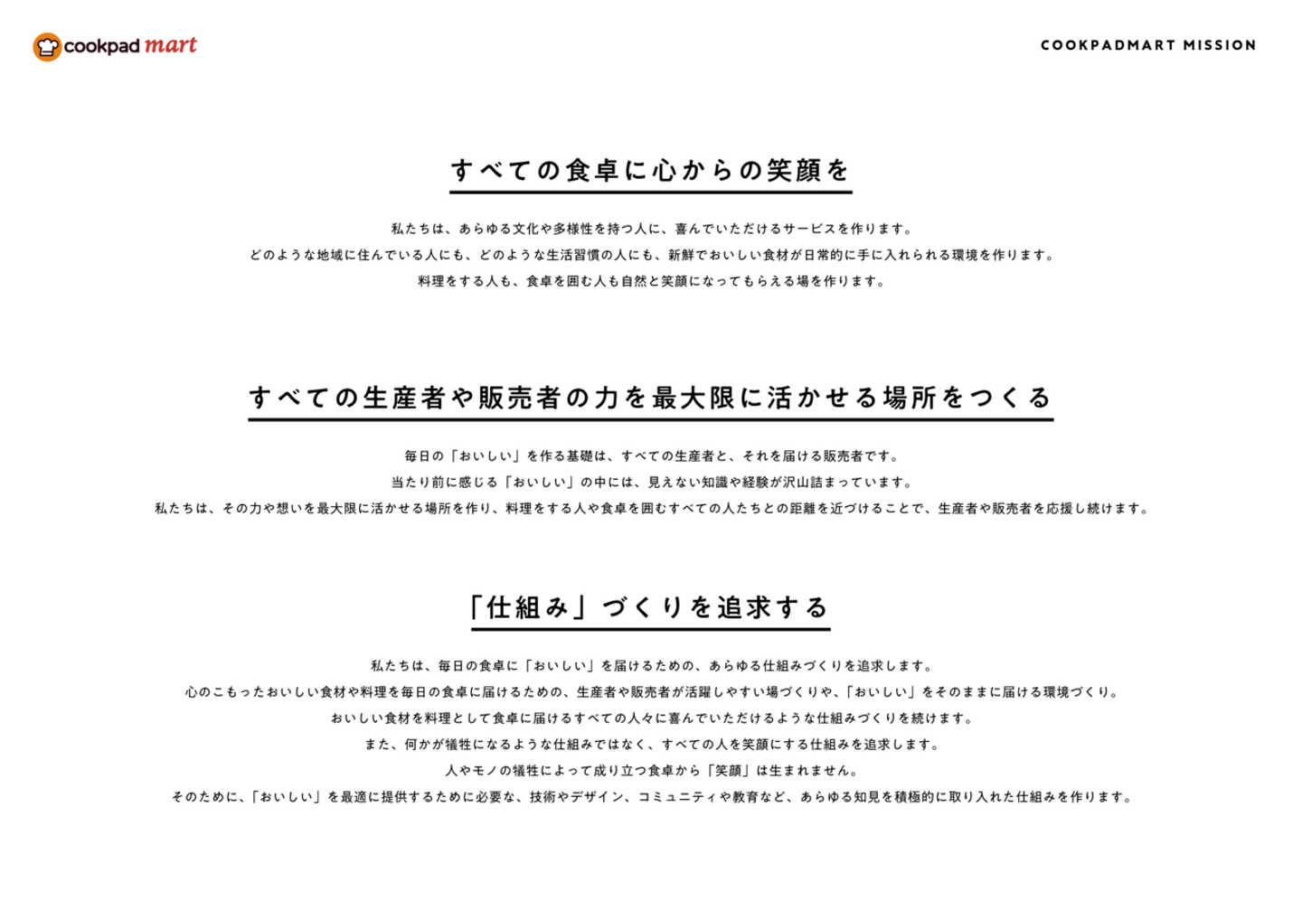 事業が成功するように、そこに貢献することが僕自身での目標でもあります。(下記はクックパッドマートが掲げるビジョン。)