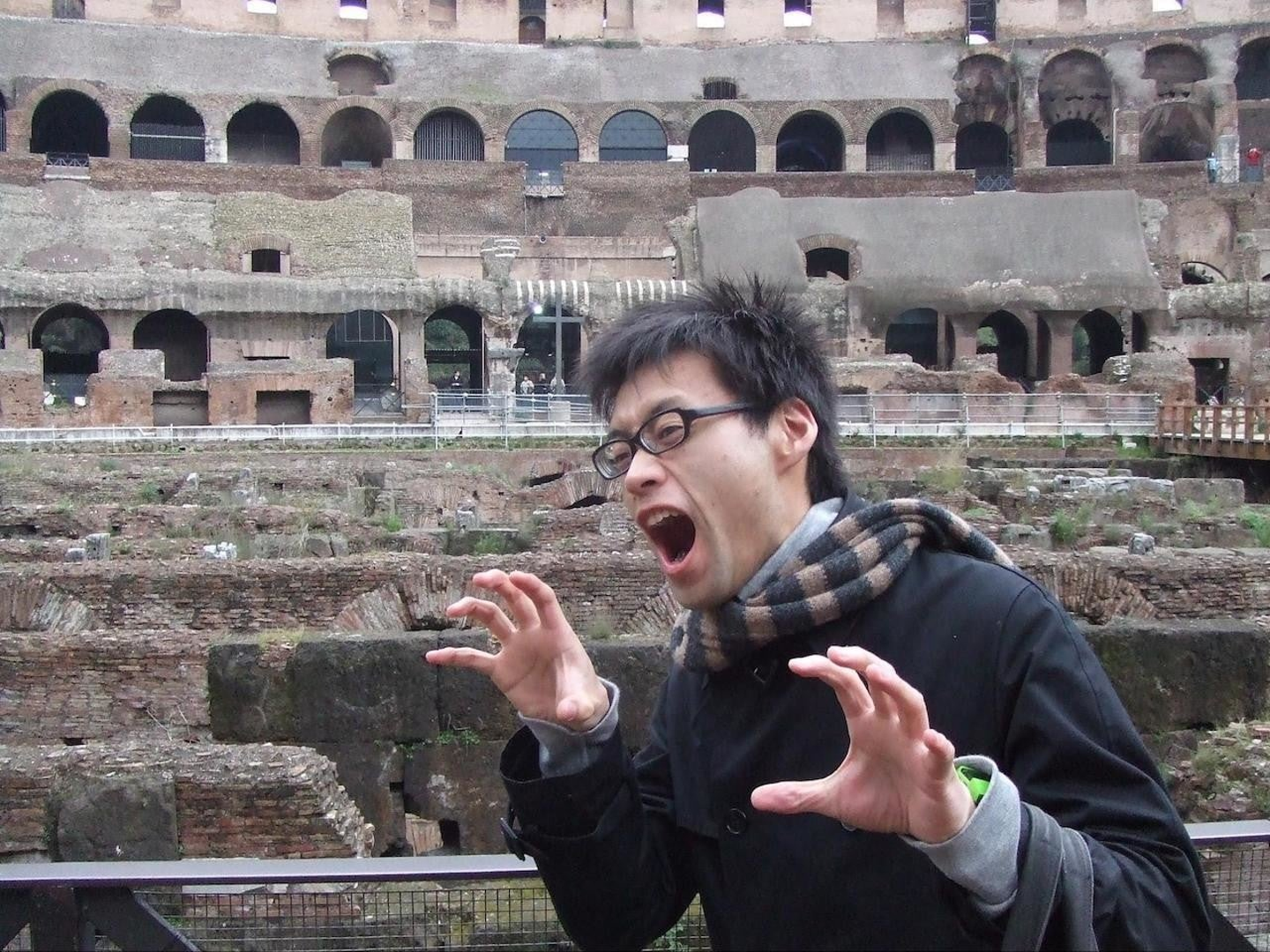 (モヤモヤしているときの気持ちを表した写真。・・・と見せかけた、大学院の卒業旅行のコロッセオで当時の猛獣をイメージしている様子です)