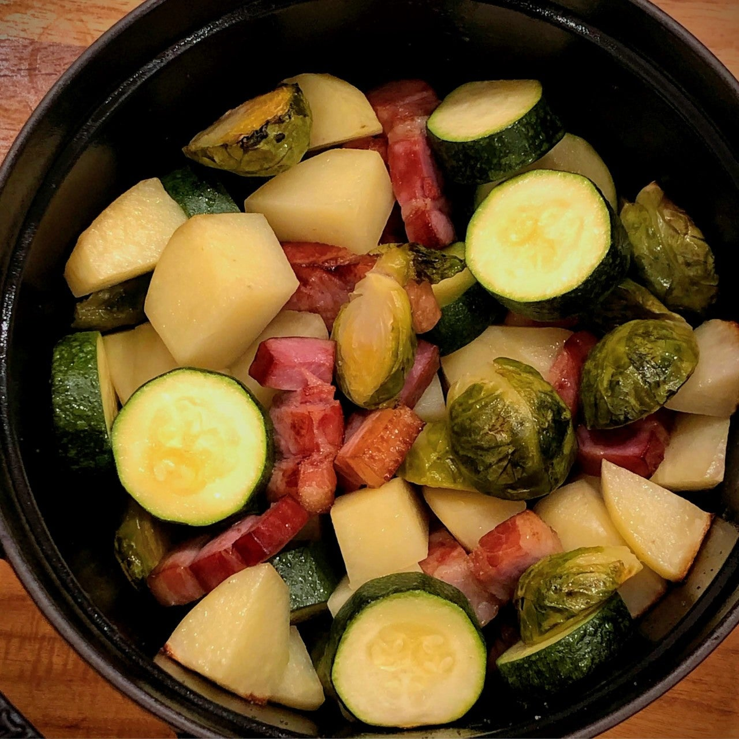 (普段は妻が食事は作ってくれますが、僕も定期的に料理をしています。これはマートで買った野菜とベーコンの蒸し焼きで、我が家の定番です!)