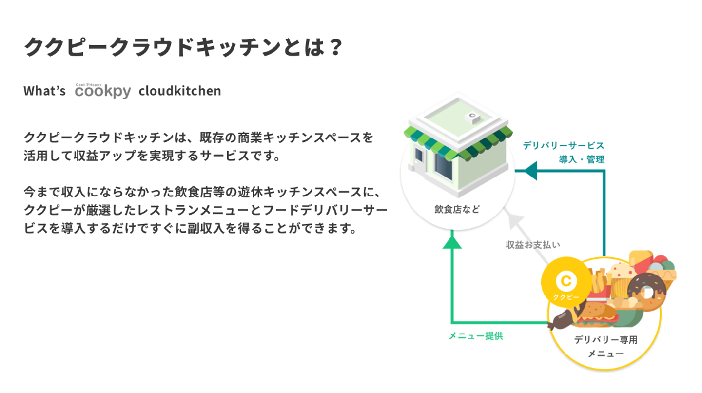 デリバリーメニューを提供したいレストランと既存飲食店のキッチンを繋ぐクラウドキッチンプラットフォーム「cookpyクラウドキッチン」を提供しており、デリバリー/テイクアウトに特化し最大限に効率化されたブランドとオペレーションの提供を通じ、稼働率の低い商業キッチンスペースを副業型デリバリーハブ転換しイートイン以外の新たな収益の創出を実現しています。