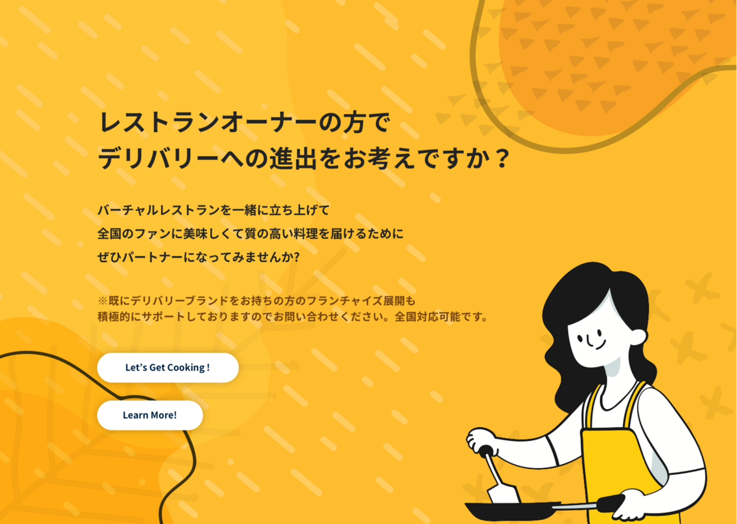 ▼デリバリーブランド/シェアリングブランドオーナー様、レストランオーナー様の方、是非一緒に挑戦しましょう。以下よりお問い合わせください。