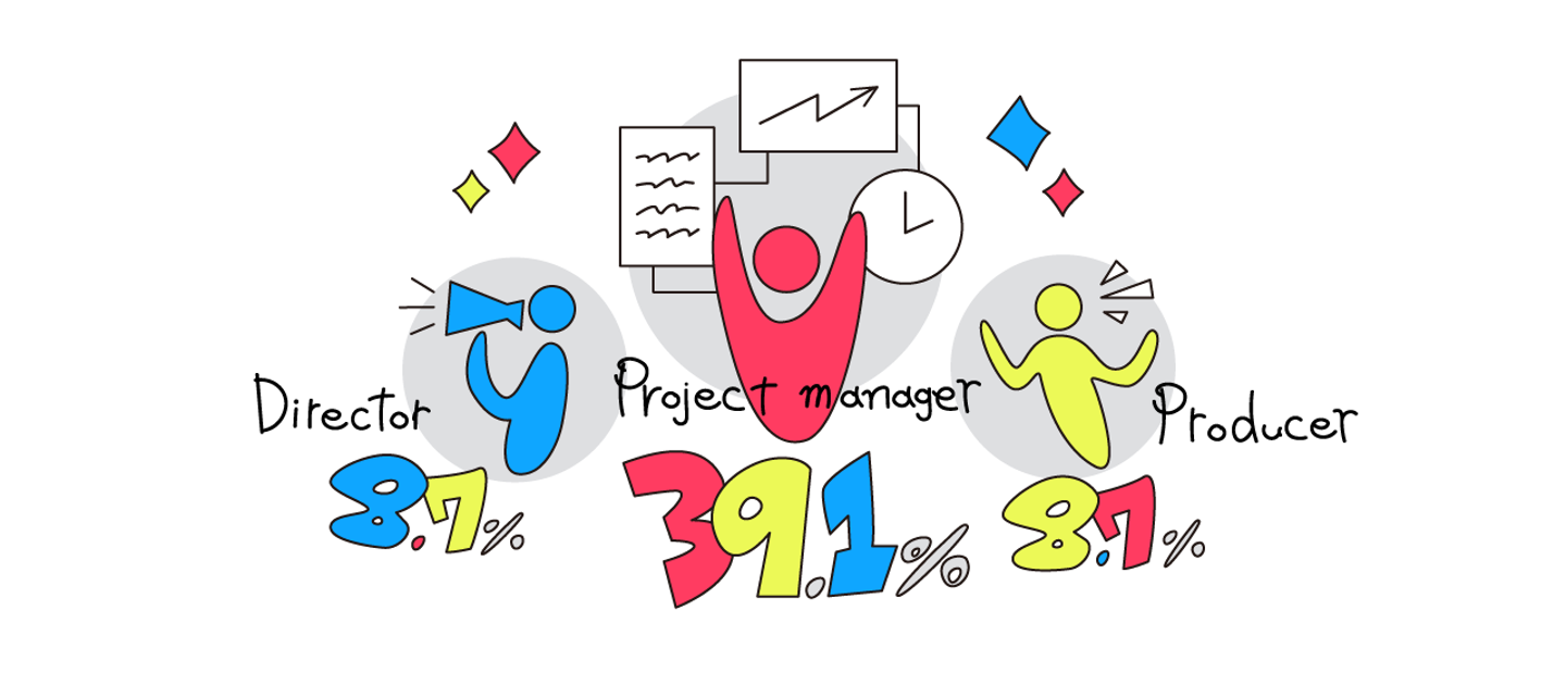 プロジェクトマネージャー、プロデューサー、ディレクター以外にも、プロジェクトファシリテーター、プロセスコンサルタント、コミュニケーションディレクター、アシスタントプロジェクトマネージャーなどなど、さまざまな役割や能力の人が働いています。