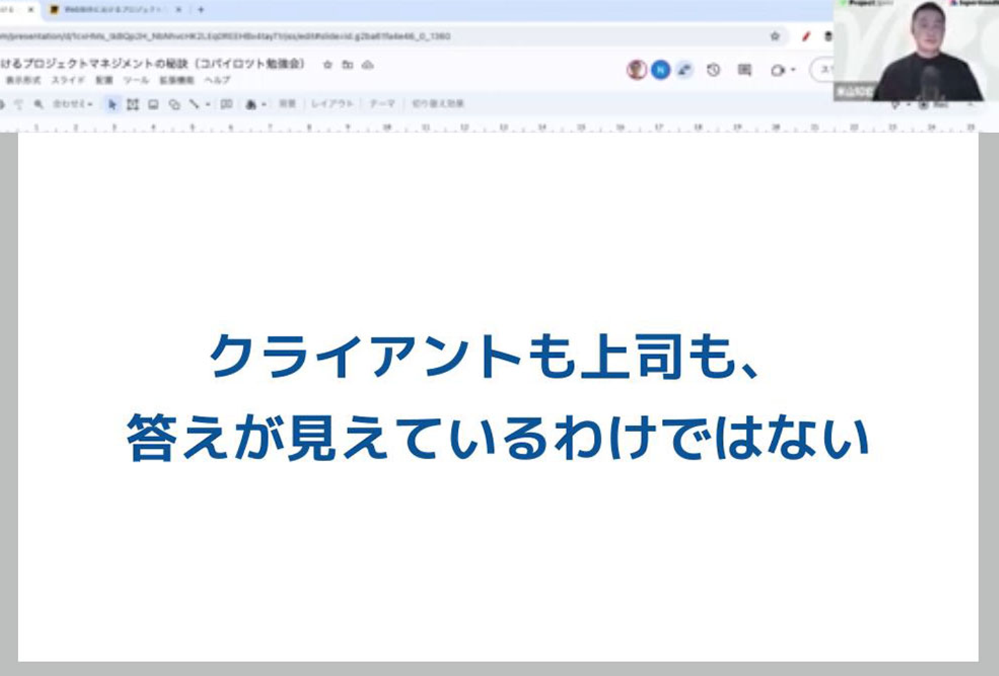今回は「プロジェクトの立ち上げ時に何をすべきかわからない」という事前アンケートを元に、前半にコパイロツト米山が、多様なプロジェクト推進に携わってきた経験をもとにプロジェクトの開始前後にすべきことについてご紹介し、後半では、大小さまざまなWeb制作のプロジェクト経験があるコパイロツト越川から、先の予測がしにくい中でプロジェクトを進める有効な方法についてご紹介しました。