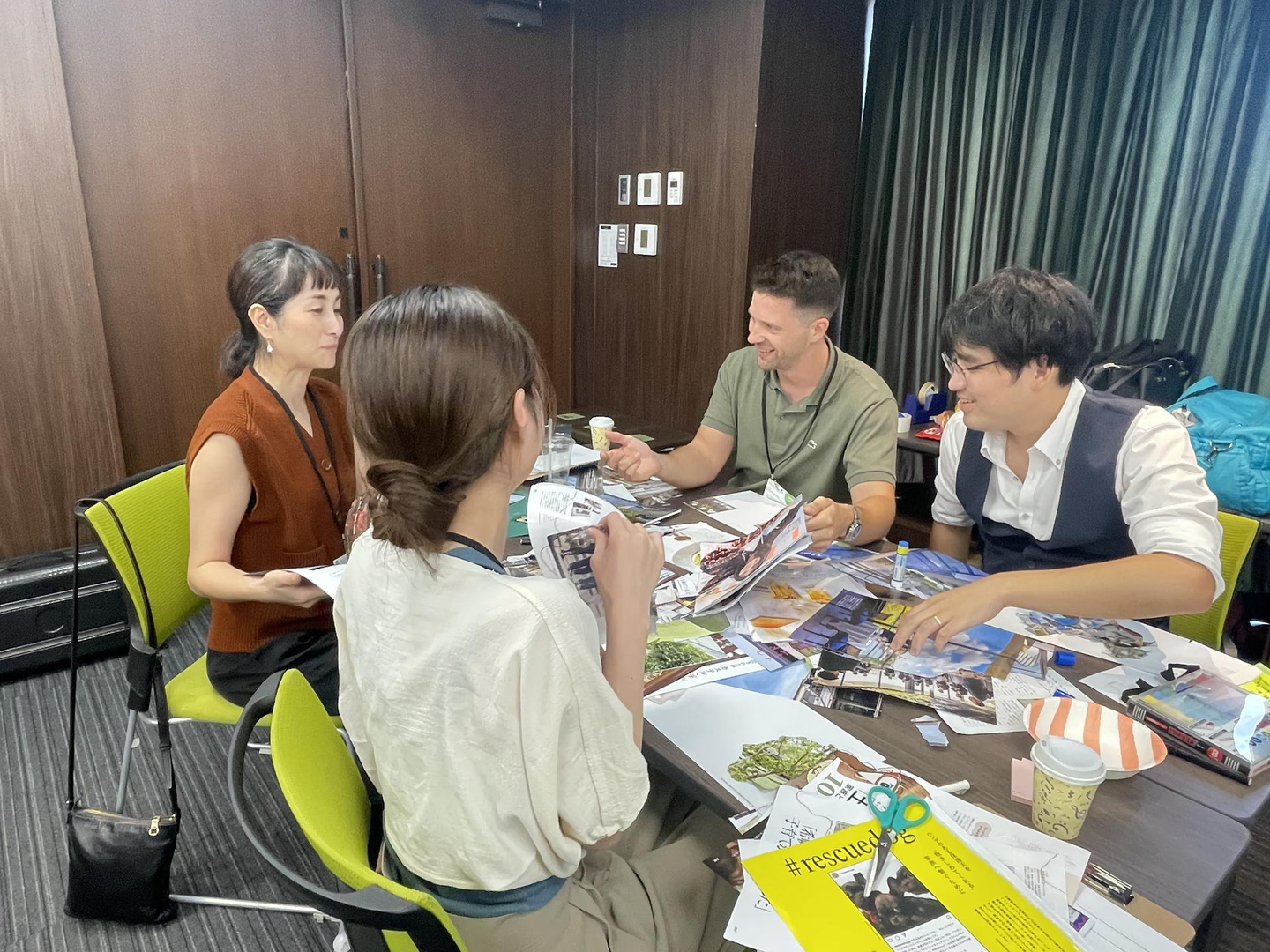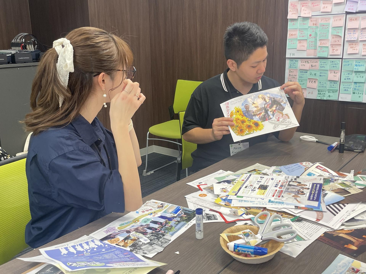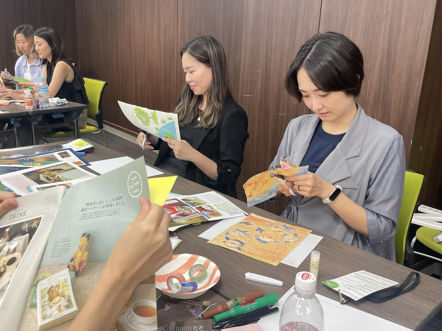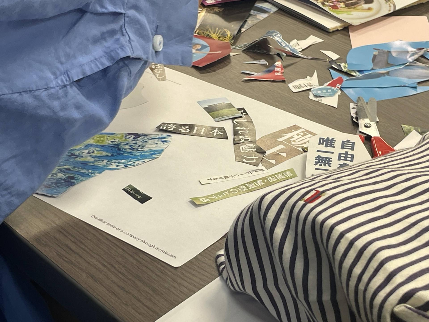 午後の研修、最初のワークは・・・「コラージュ」。コラージュって!?と思われた方、はい、そうです。あの、写真の切り抜きを貼り付けて構成するコラージュです。ちなみにフランス語で「糊付け」という意味だそうです(弊社フランス国籍のスタッフより)。