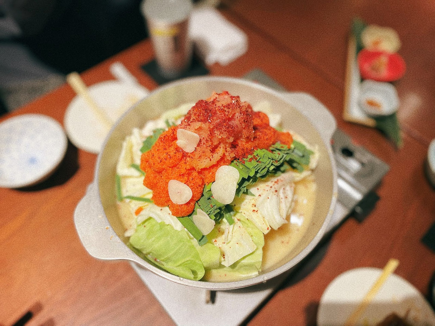 新チーム結成のお祝いで行ったもつ鍋屋さん。明太子がどど〜んと乗った「博多明太もつ鍋」と炭火焼き鳥が名物のお店です。あまりにも大きな明太子の登場に、みんな思わず写真を撮っていました。〆にはもちろんちゃんぽんを追加しました!