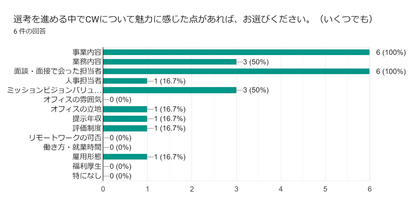 中でも、カウンターワークス(以下CW)への入社を決めた理由として大きかったものがこちら。「事業内容」「業務内容」、そして中で働く「人」と「ミッションビジョンバリュー(MVV)」に魅力を感じてくれたメンバーが多かったようです。