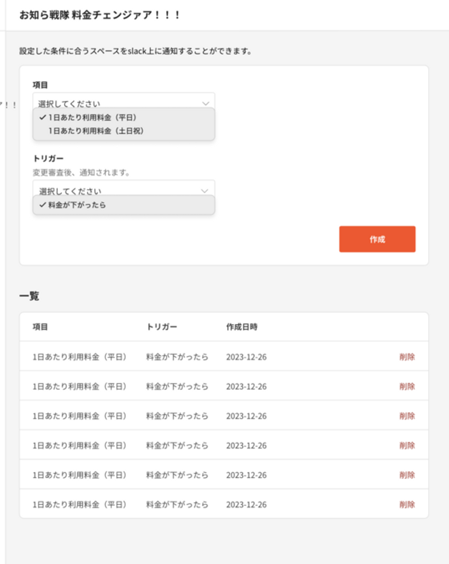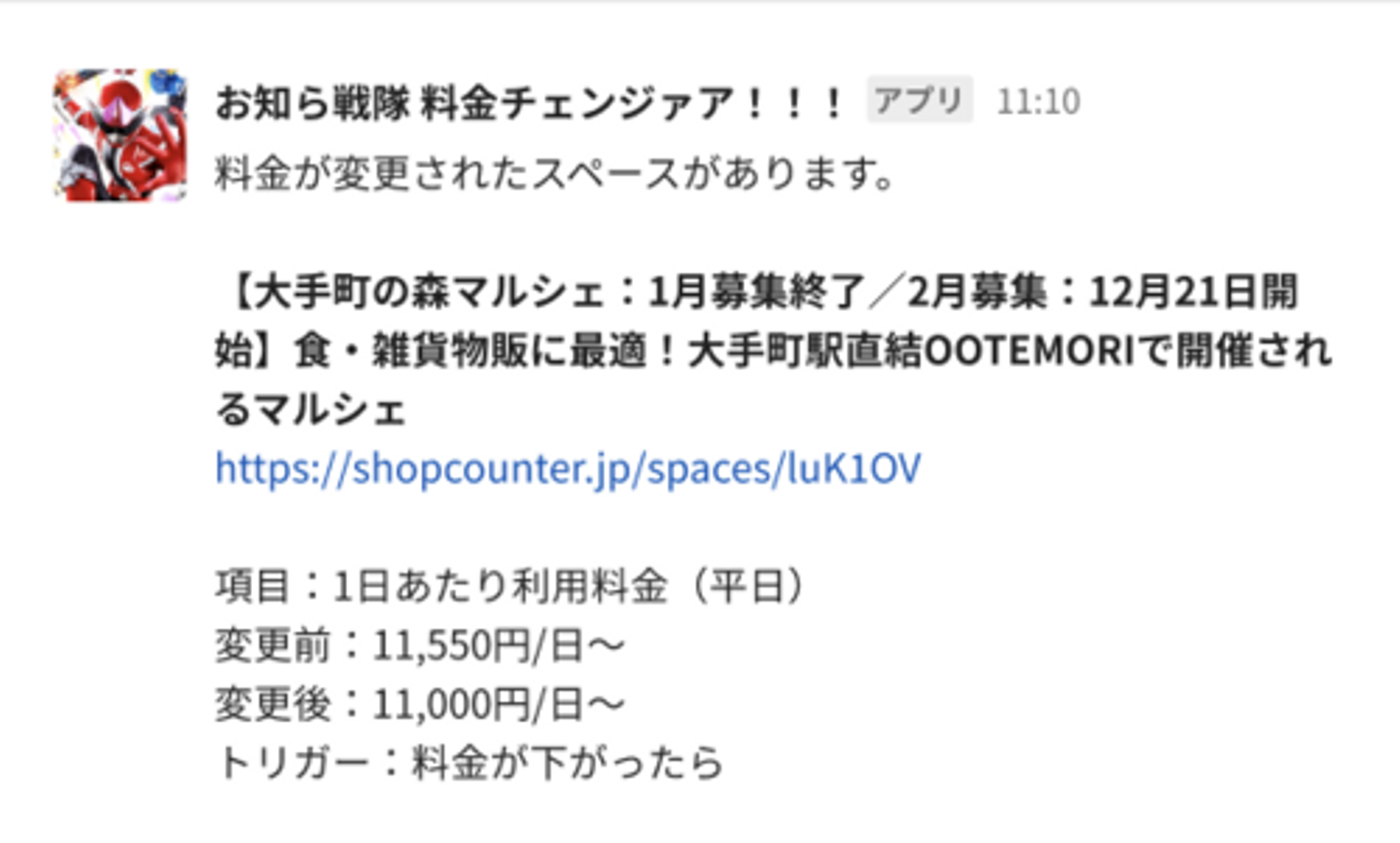 「SHOPCOUNTERに登録されてるスペースの掲載変更情報(掲載価格の上下など)を検知し、Slackに通知するアプリ」
