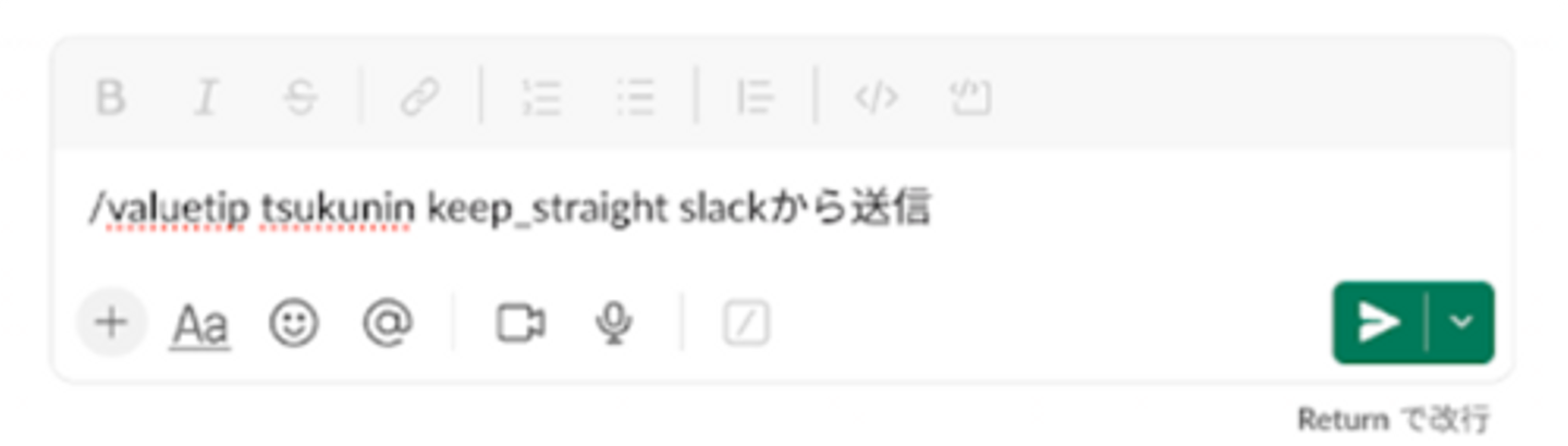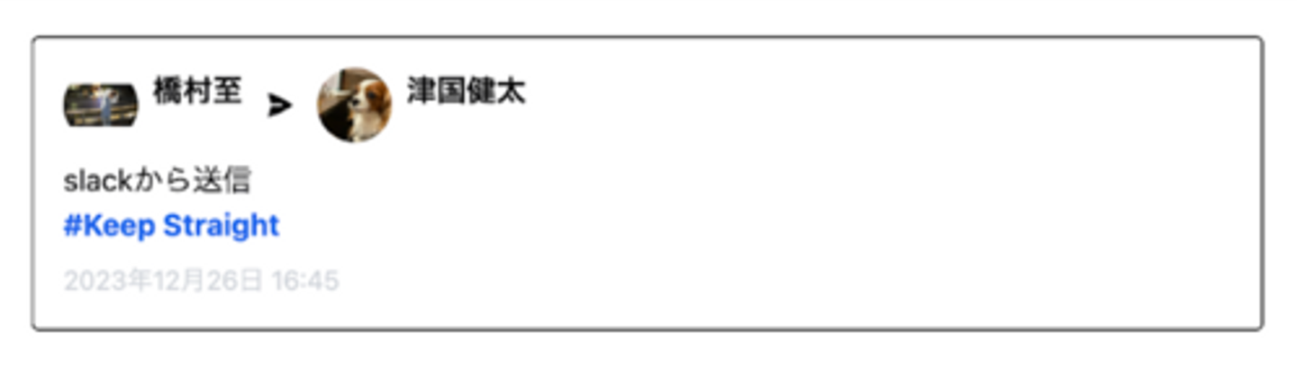 弊社が掲げている3つの行動指針=Value(Go Forward, One Team, Keep Straight)を、誰がどのように体現したかを投稿することで全社的にその活動を可視化することを目的にしました。このアプリでは、Valueを体現した人に、該当Valueとメッセージを投稿することができます(Slackからも)。