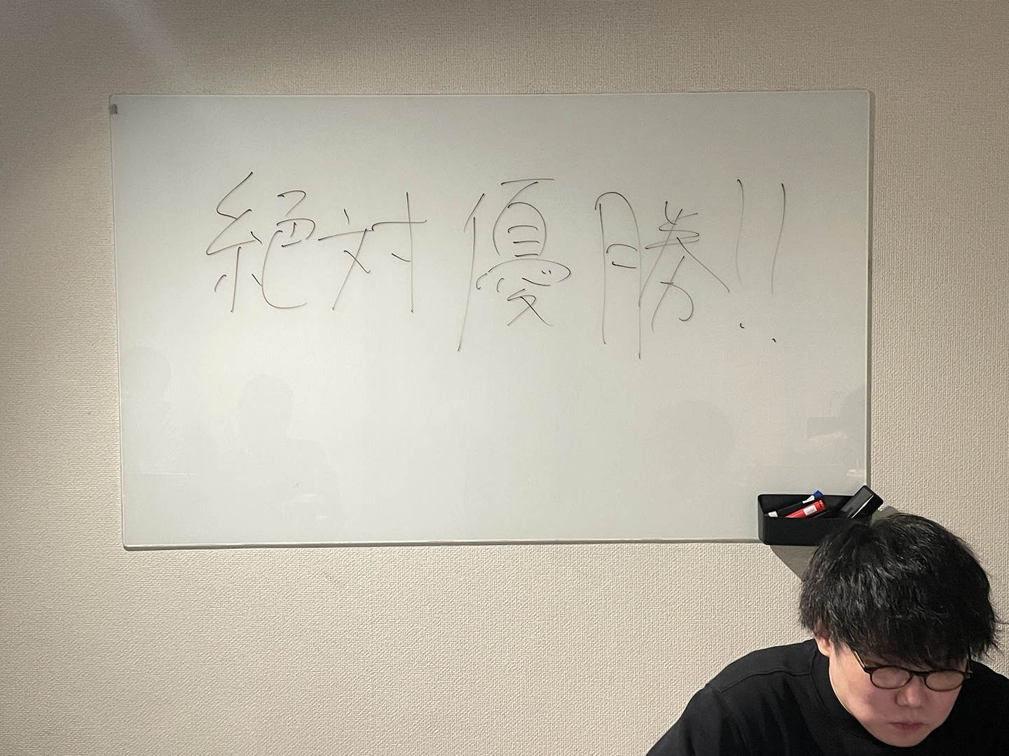 「絶対優勝‼」の文字を背景に何かを食しながら作業に没頭する北出さん(Enterprise事業部 開発G)