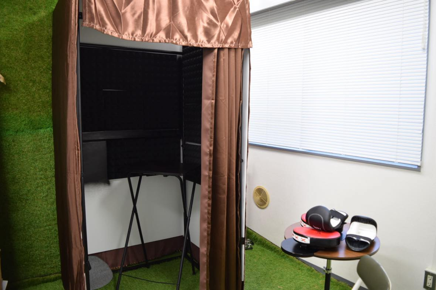 ここは一面芝生がひかれている個性的なお部屋で、写真の手前にはなぜかボクシンググローブだったりダンベルだったりがあります…