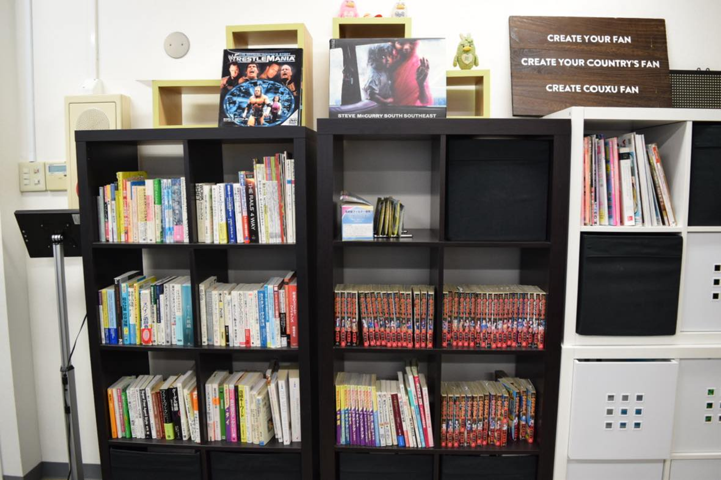 他にも漫画がずらっと並んでいたり、COUXUのビジネスにも有用な海外関係やデザイン関係の本があったりするスペースもあります。