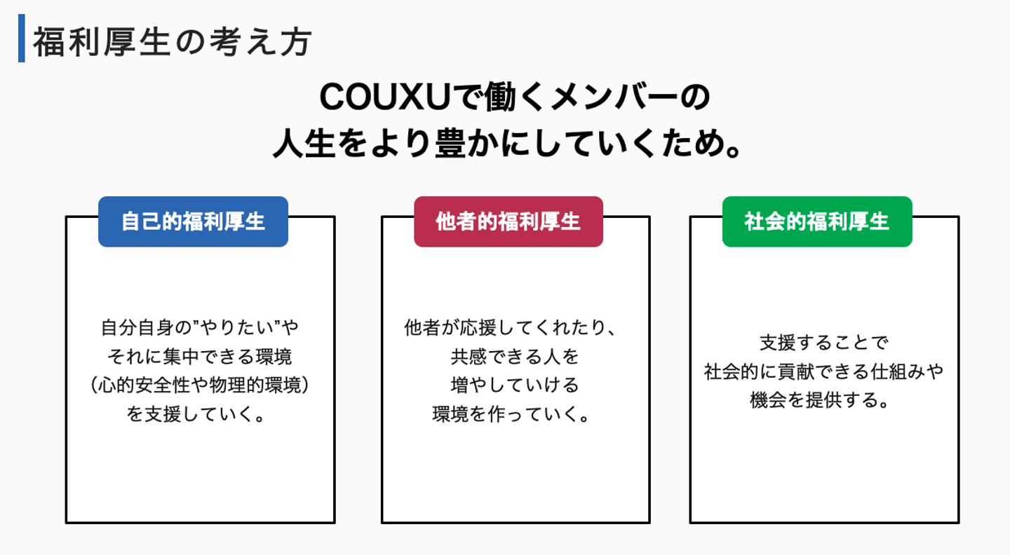 COUXUではメンバーそれぞれの人生を豊かにするために3種類の福利厚生を設けています。