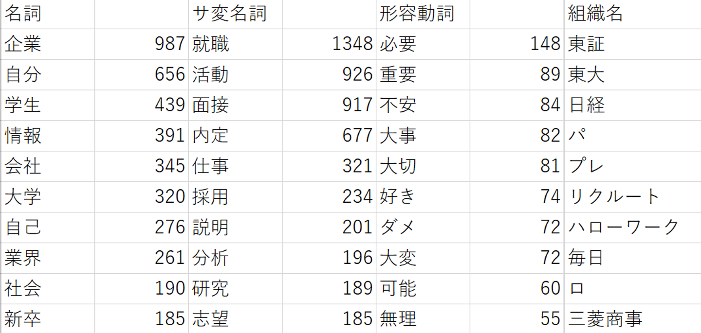 名詞、サ変名詞からは就活ですべきことが推測できます、「自己分析」「企業・業界研究」「面接」etc.見ているだけでうんざり。