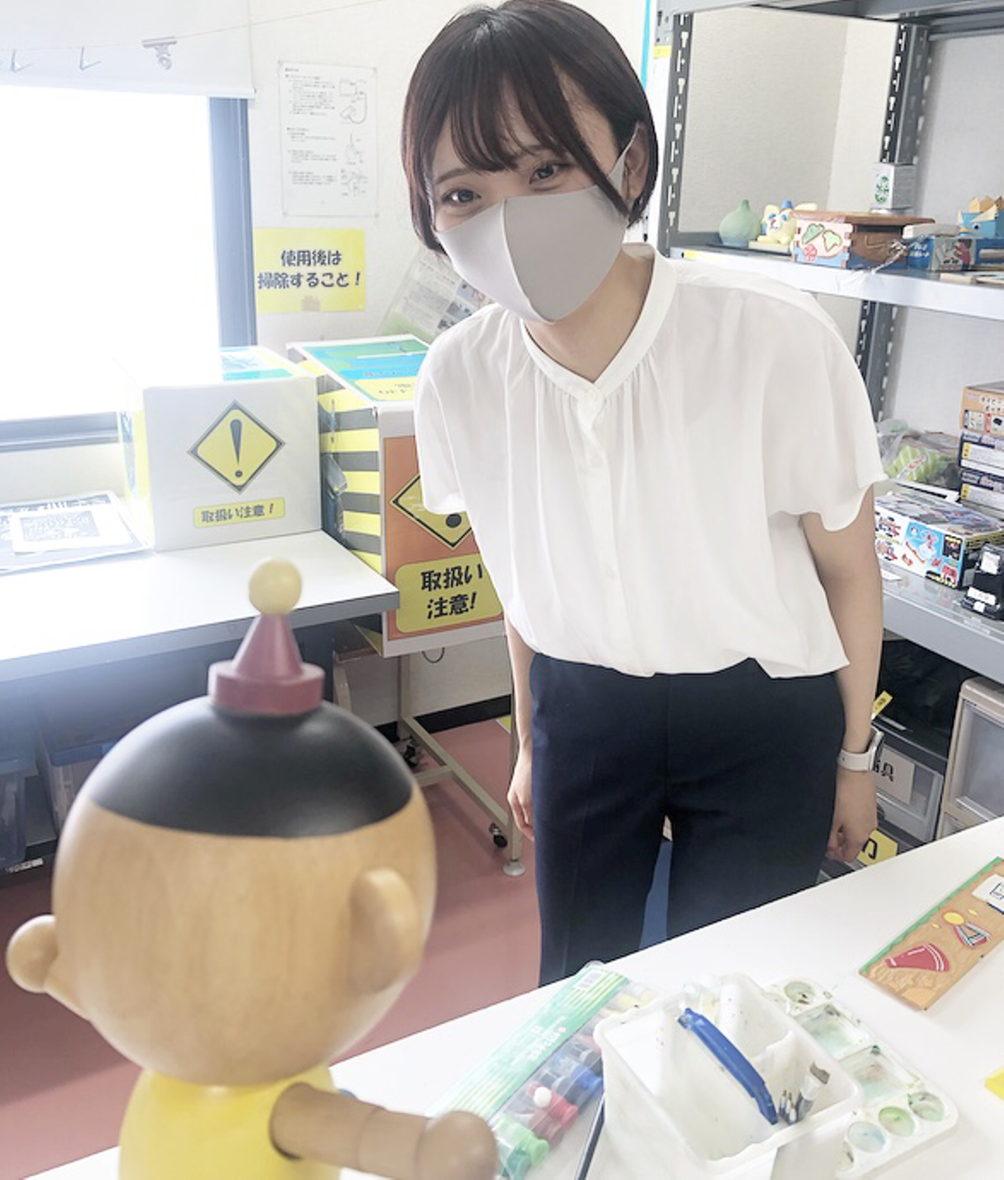 須賀さん「テリオくん、この部屋は工作室です。学校みたいで面白いですよね。今は商品の