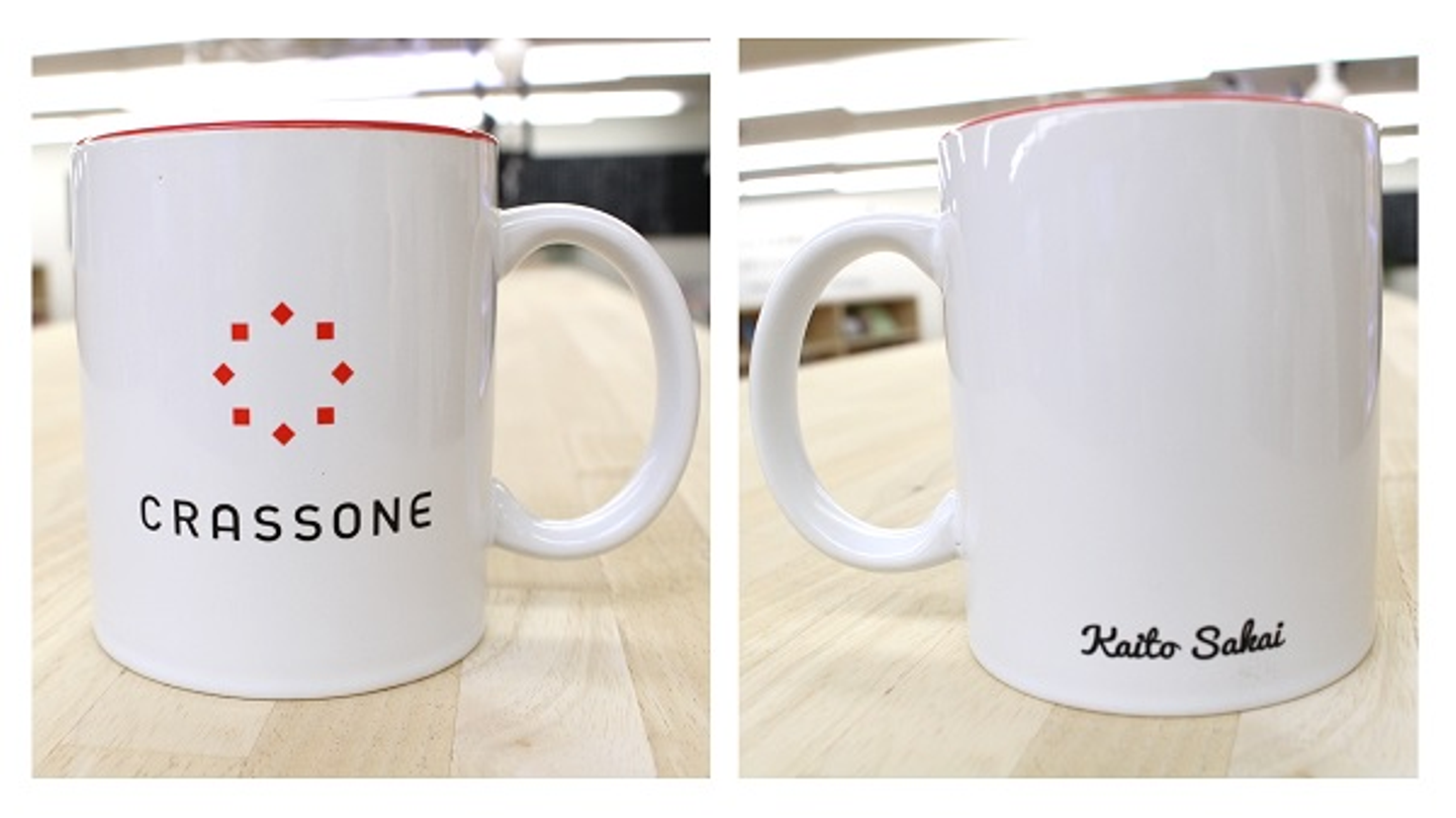 そして、懇親会の最後に、感謝と祝福の想いのつまった記念品を1人1人に手渡しました。記念品は、この日のためにデザインした、クラッソーネのロゴマーク入りマグカップ!後方に各自のイニシャルも入れました。入社したらオフィスで使ってくれると嬉しいです。