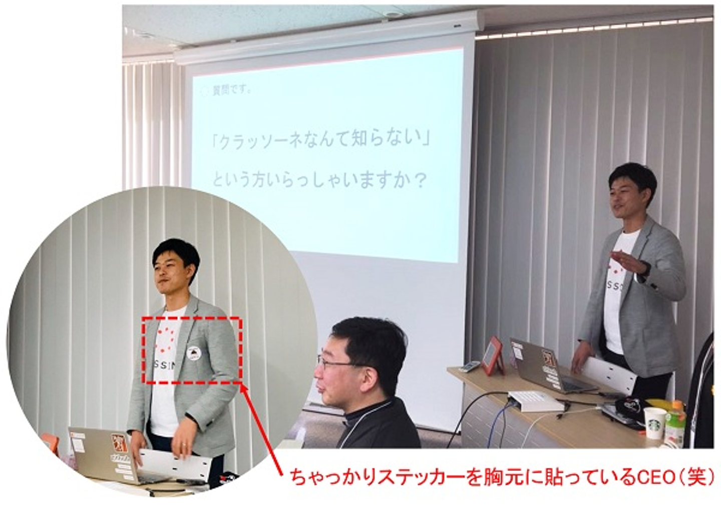 それに続いて弊社CEO川口が自虐ネタを加えた会社紹介で知名度アップを測りました。