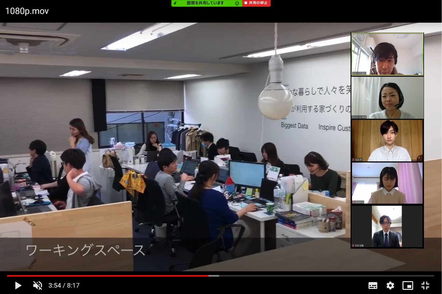▲Zoomの「画面共有」機能で参加者と一緒にオフィスツアーの動画を観ながら解説を入れる