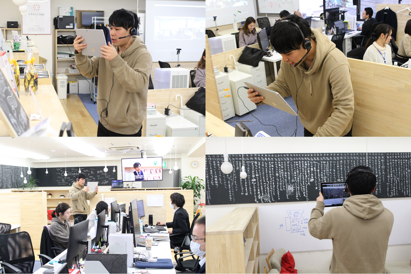 しかし、4月6日からクルー全員がリモートワークに移行したため、採用担当者も全員、自宅での勤務となり、ライブ感のあるバーチャルオフィスツアーをできなくなりました。そこで次にとった第二弾の作戦として、少しでも活気ある普段のクラッソーネの姿をお見せするため、クルーがリモートワークになる前に社内を動画撮影し、説明会でその動画を再生しながら解説する「ビデオバーチャルオフィスツアー」を行いました。