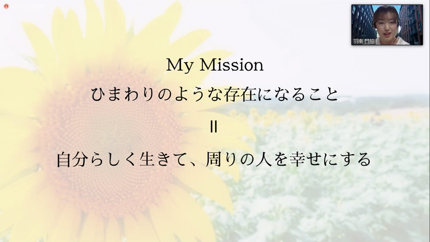樋口がマイミッションを考えるにあたり、「今までの人生で一番充実していた瞬間」にヒントを見出し、チャレンジの連続だった大学時代を振り返りながら、マイミッションを解説していました。