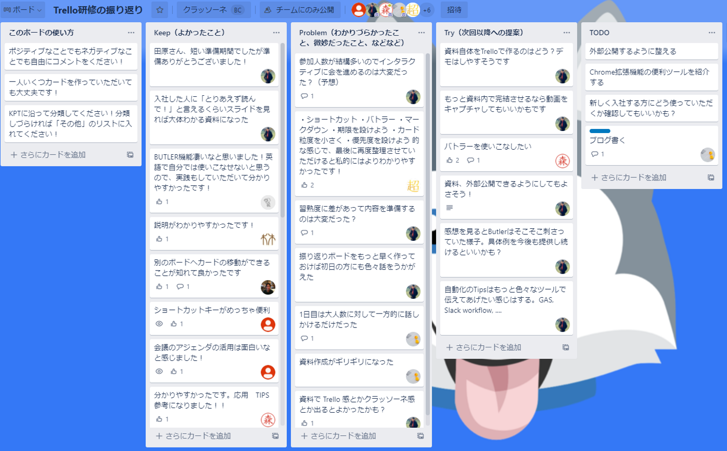 参加者各自にこの研修の振返りを直接Trelloカードに作成してもらうというもの。(KPTのフレームワークを使っています)早速Trelloを自分たちで使ってみるという体験にもなりましたし、全員の振返り内容が即座に可視化され、その場で認識を合わせることが出来ました。