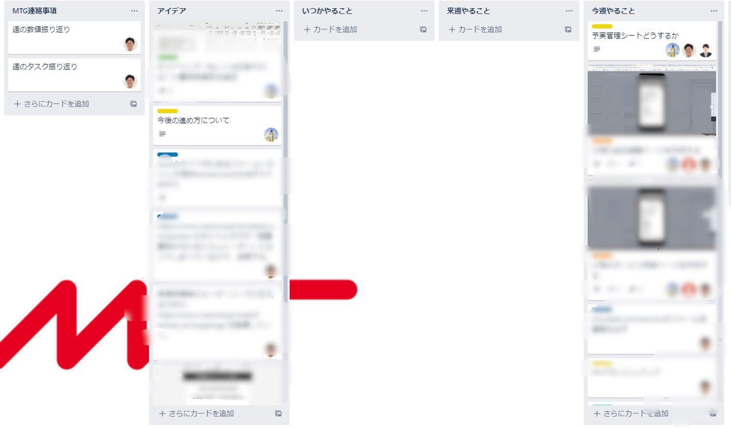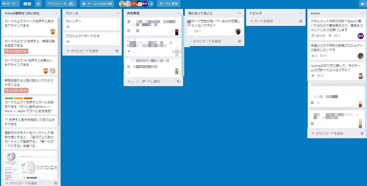予めボードに話しておきたい内容や共有したい内容をカードに書き込んでおくことで進行がスムーズになっています。(このボードでは「共有事項」「気になってること」「トピック」「アクション」等で分かれています)