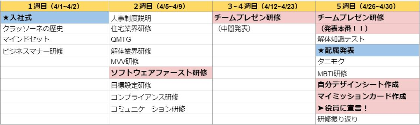 これらはITスタートアップ企業の体制やスピード感が理解出来たこと、そして、クラッソーネのカルチャーが感じられ、同じく研修を受けた同期の評判もとても良かった研修でした。