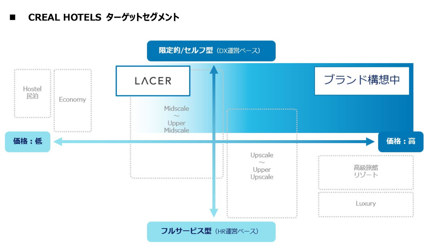 現在クリアルホテルズが展開しているブランドは中価格帯のDXホテル「LACER」のみですが、今後はさらにハイエンドグレードなブランドとして、ラグジュアリーヴィラ、ブティックホテル、なども展開していけたらと考えています。現在「限定的/セルフ型(DX 運営ベース)」 × 「高価格帯」のホテルブランドを中心に開発中ですが、ゆくゆくは上流から下流までの価格帯を網羅するようなイメージを持っています。これから入社する方には、そのブランド拡大や構築に力を貸していただきたいです。